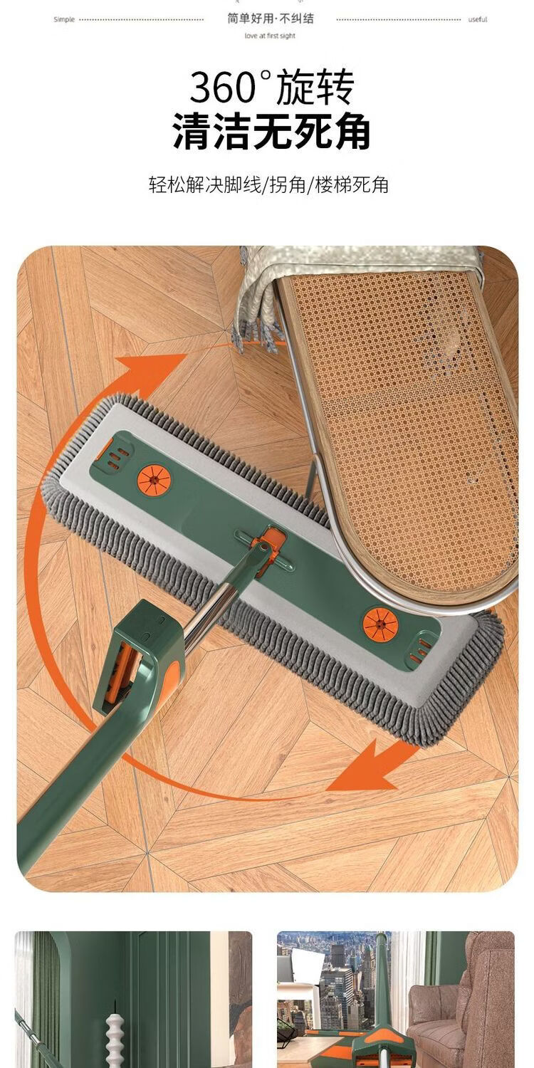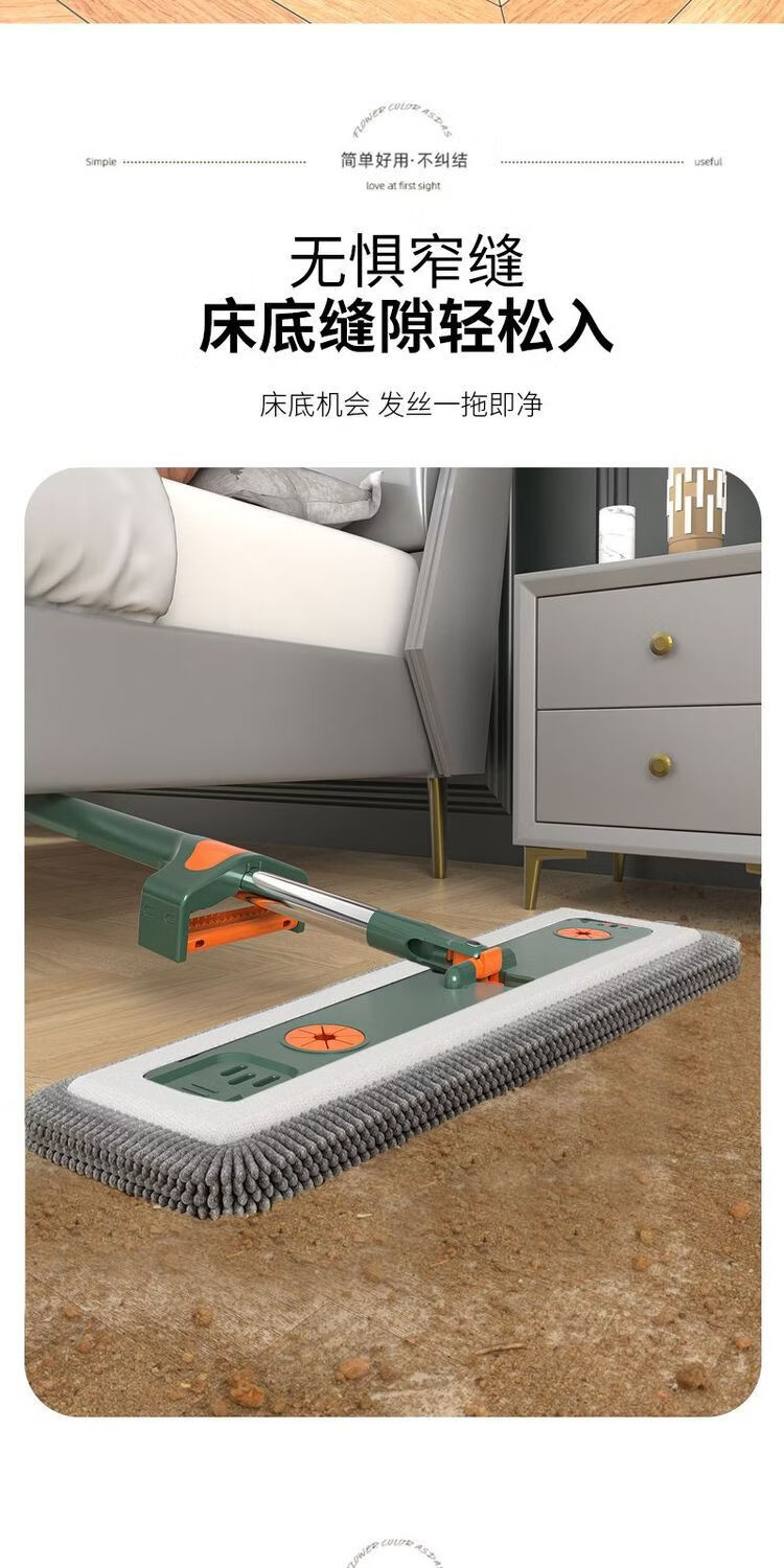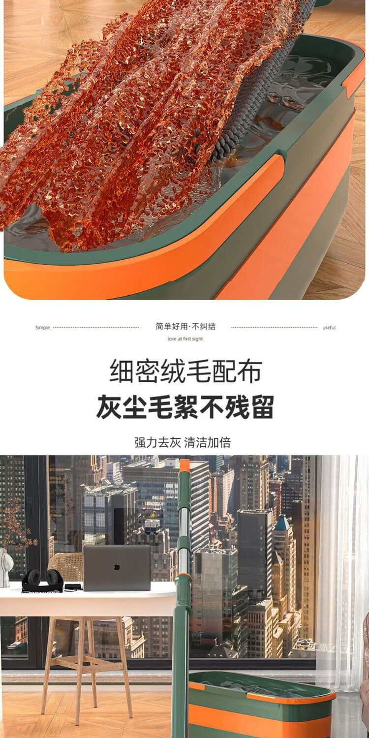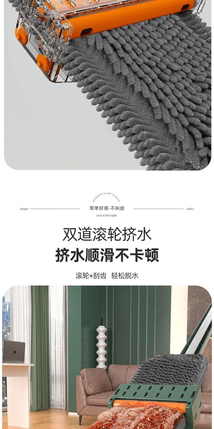 Mop set with bucket chenille hands-free flat mop household lazy one mop dry and wet dual-use long-hair absorbent mop mop orange green-chenille 45CM panel + extension rod 4 replacement cloths chenille