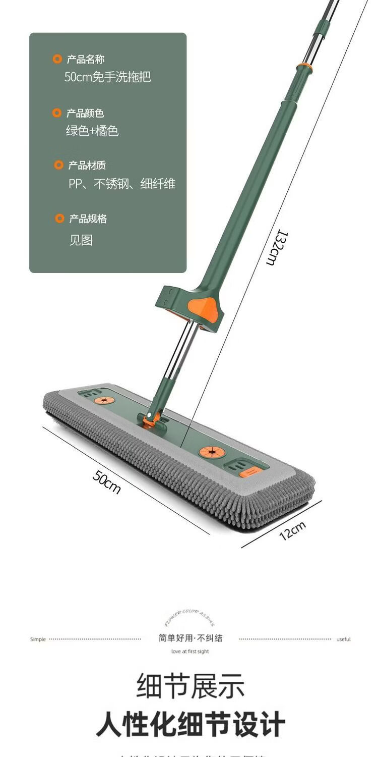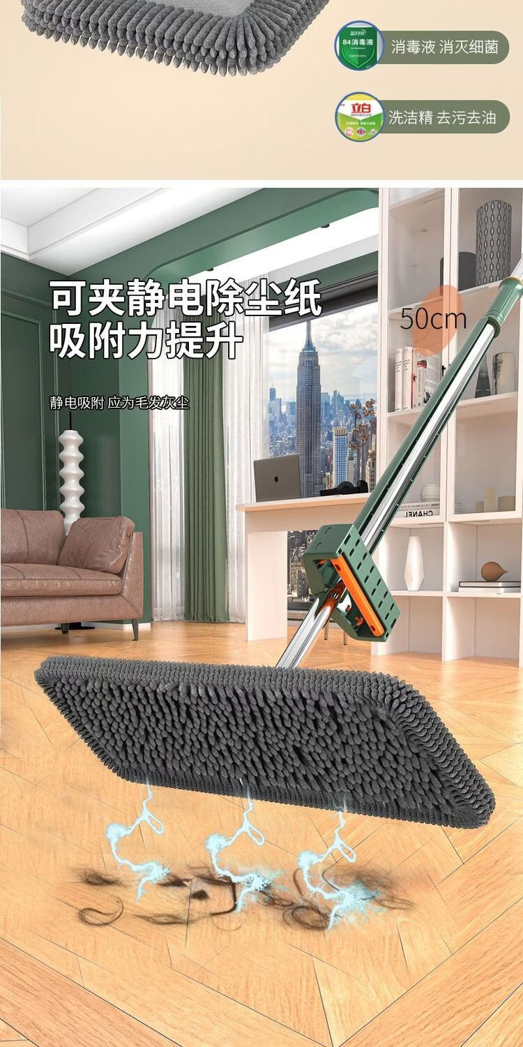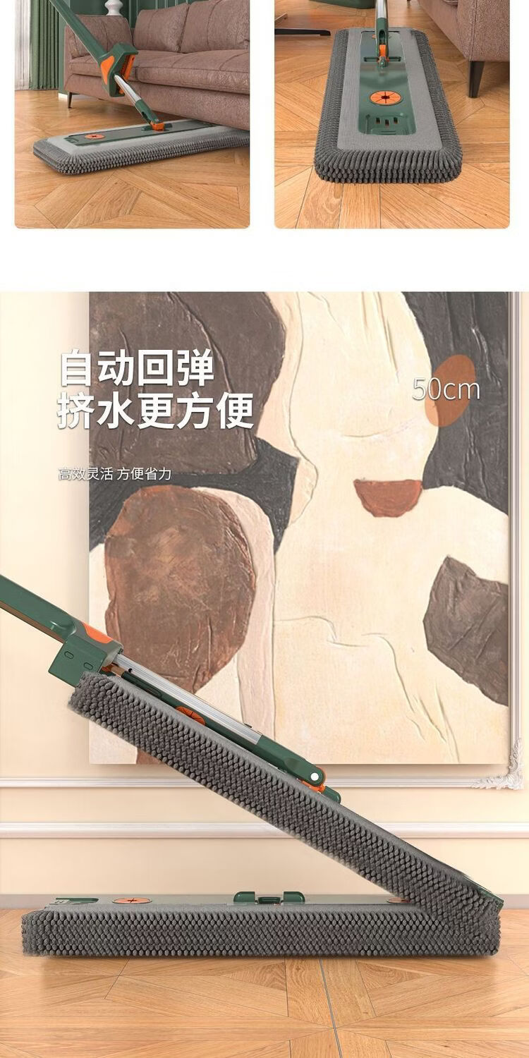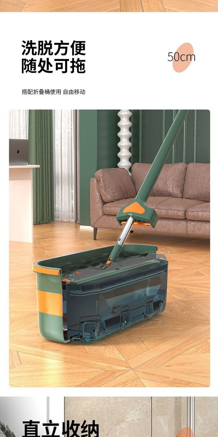 Mop set with bucket chenille hands-free flat mop household lazy one mop dry and wet dual-use long-hair absorbent mop mop orange green-chenille 45CM panel + extension rod 4 replacement cloths chenille