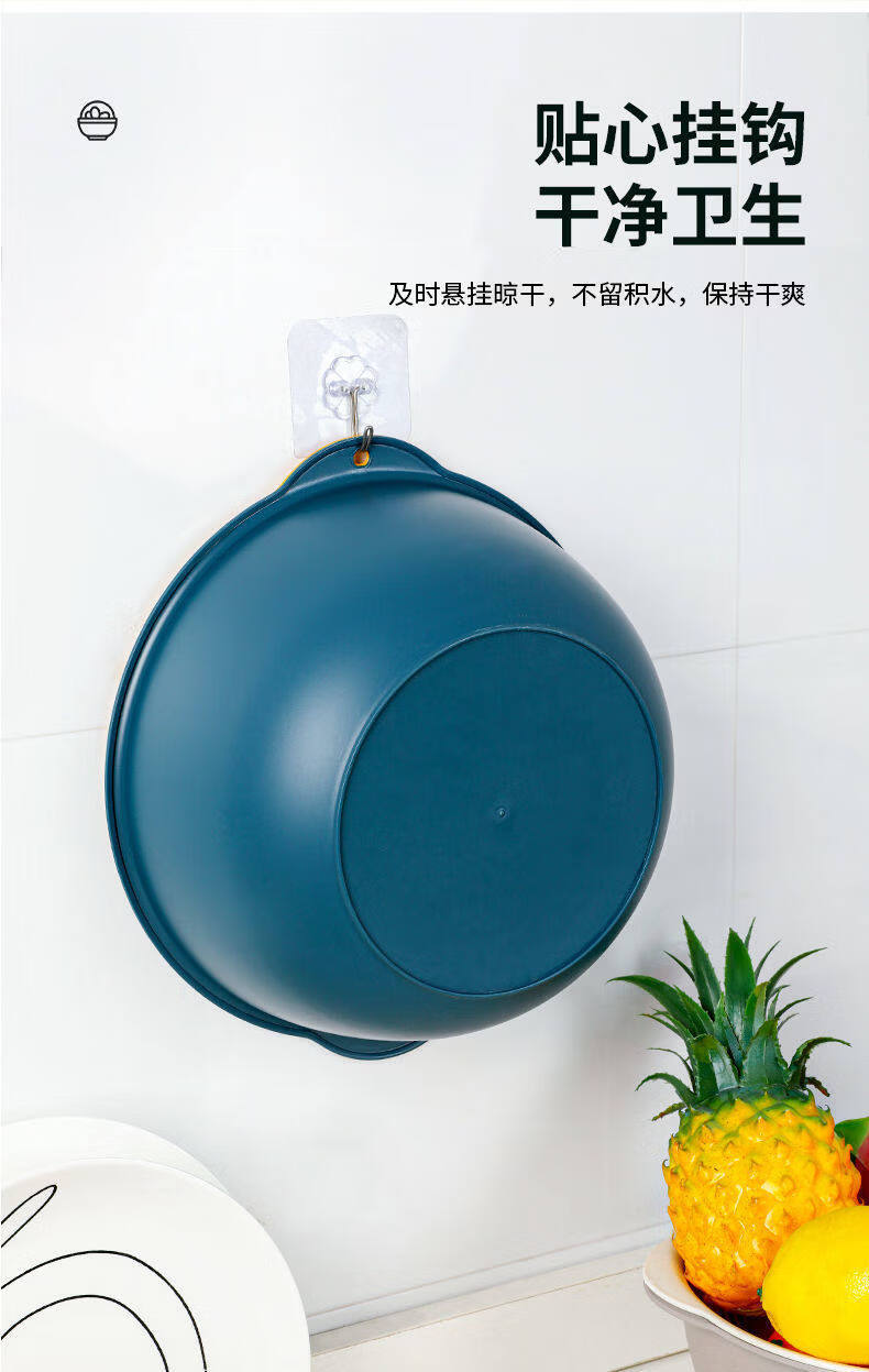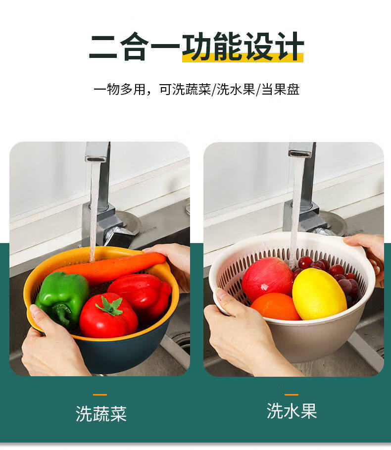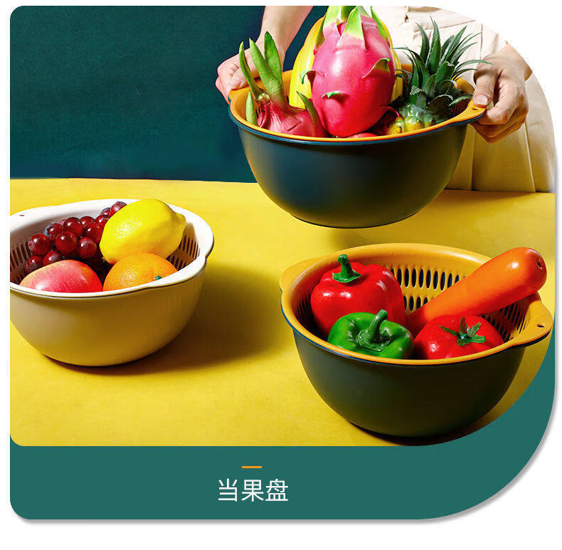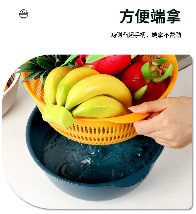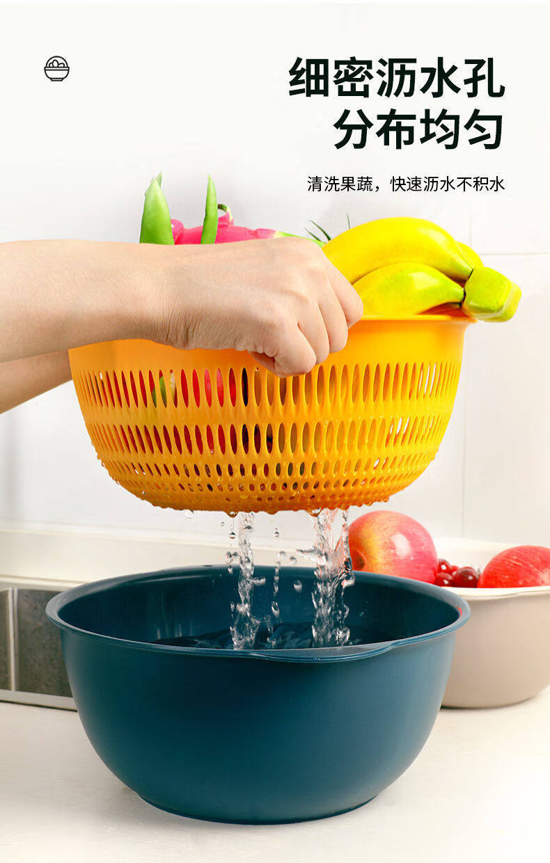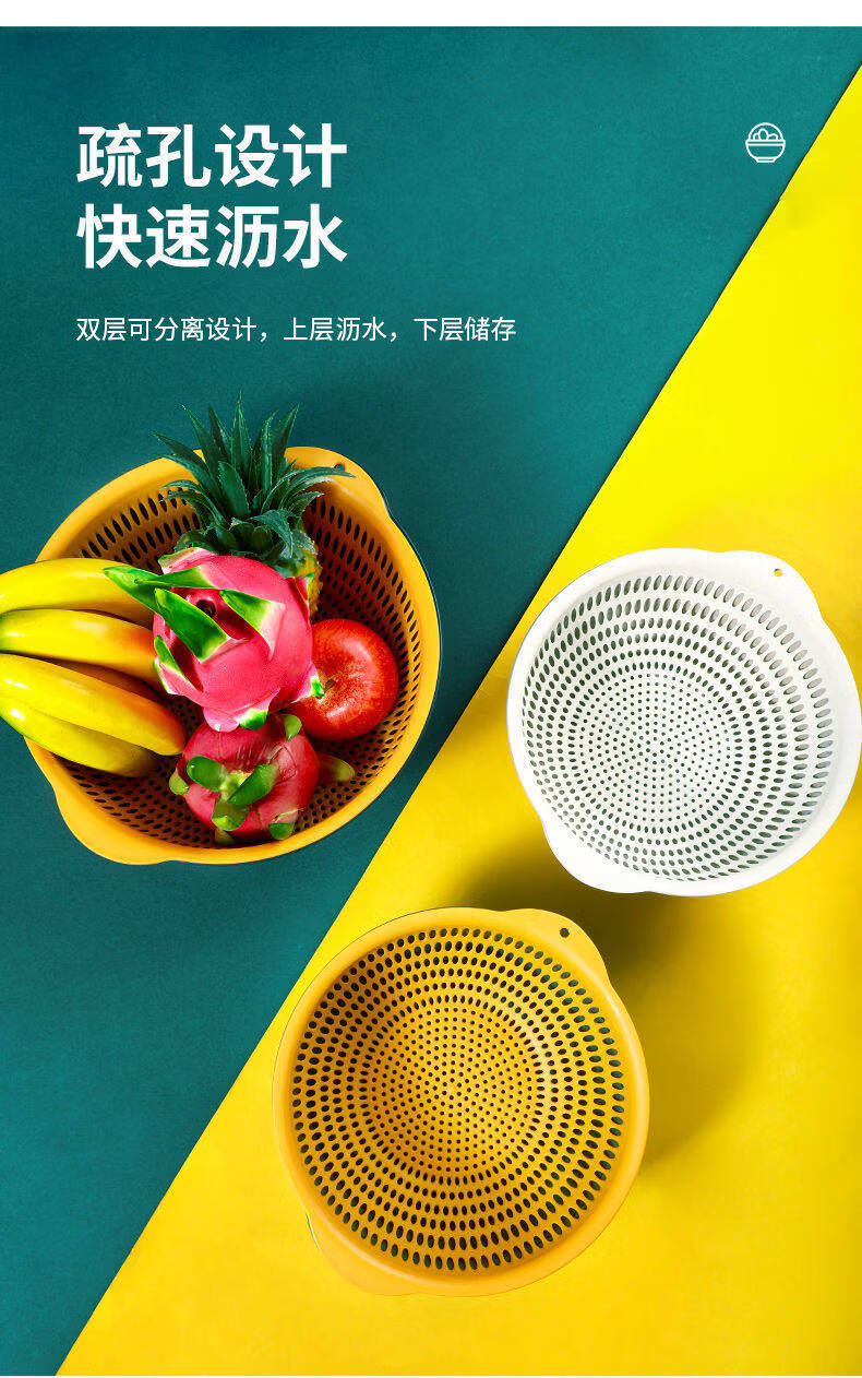 Tuojin double-layer hollow vegetable washing basket household large drain basket fruit basin kitchen creative fruit plate blue and yellow small 2-piece set