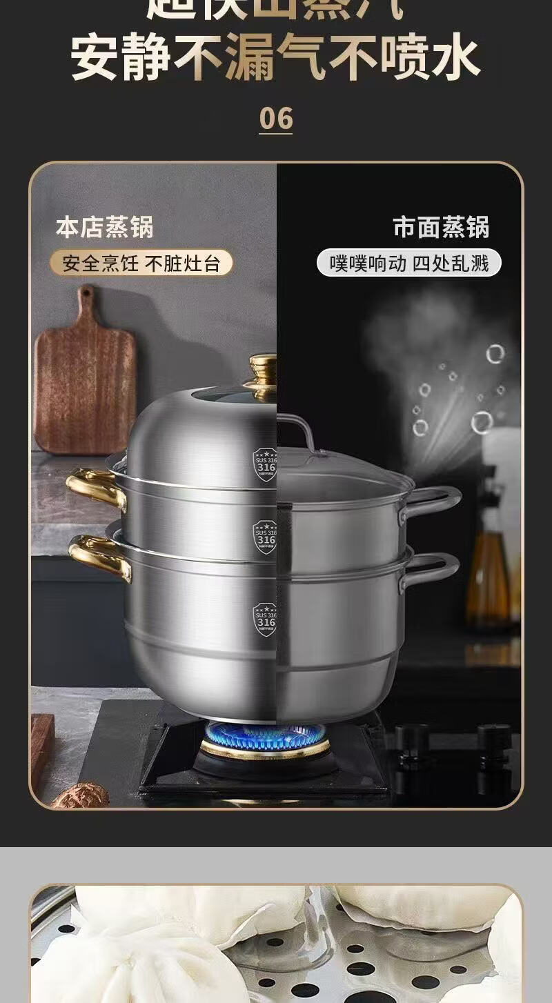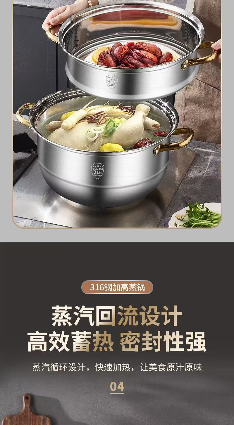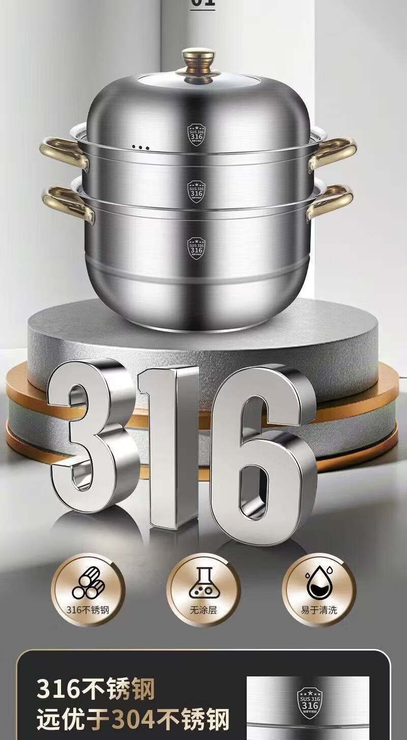 SUPOR's same style steamer 316 extra thick food grade stainless steel household double layer three layer steamed buns extra thick 316 food steel three layers 36cm