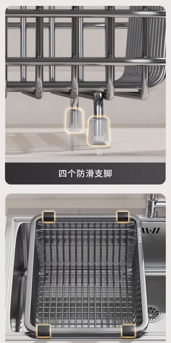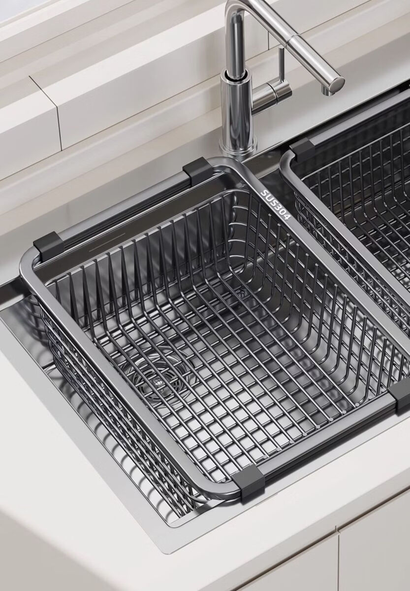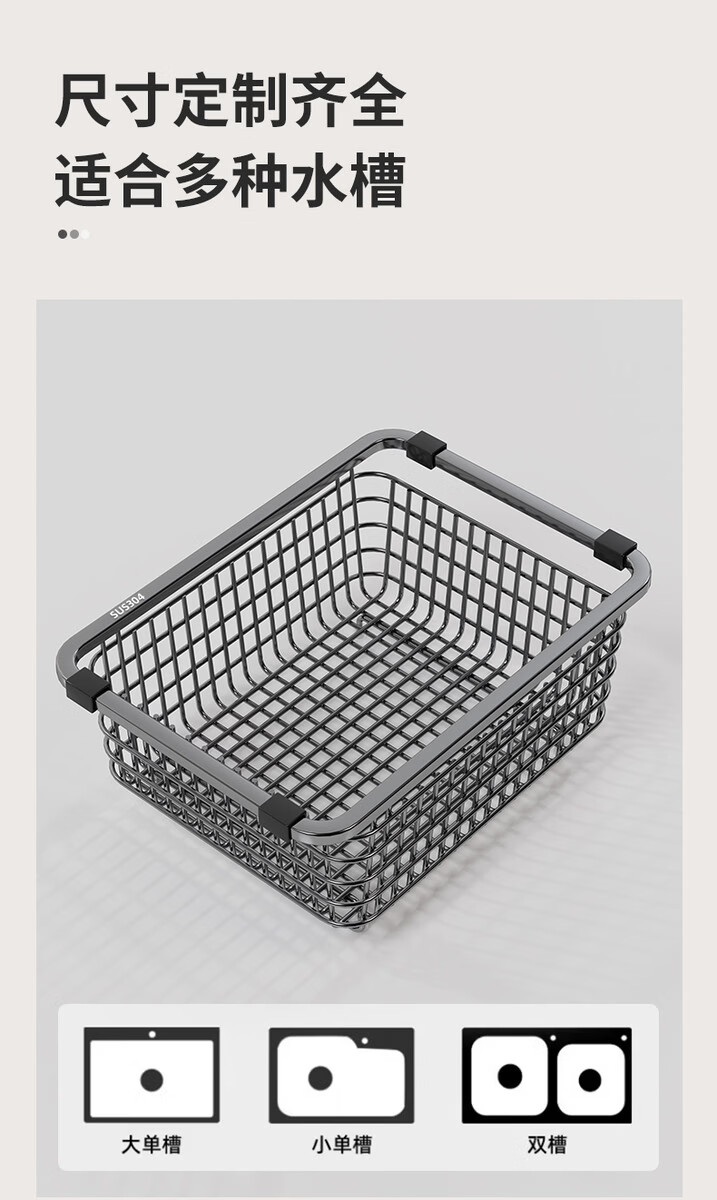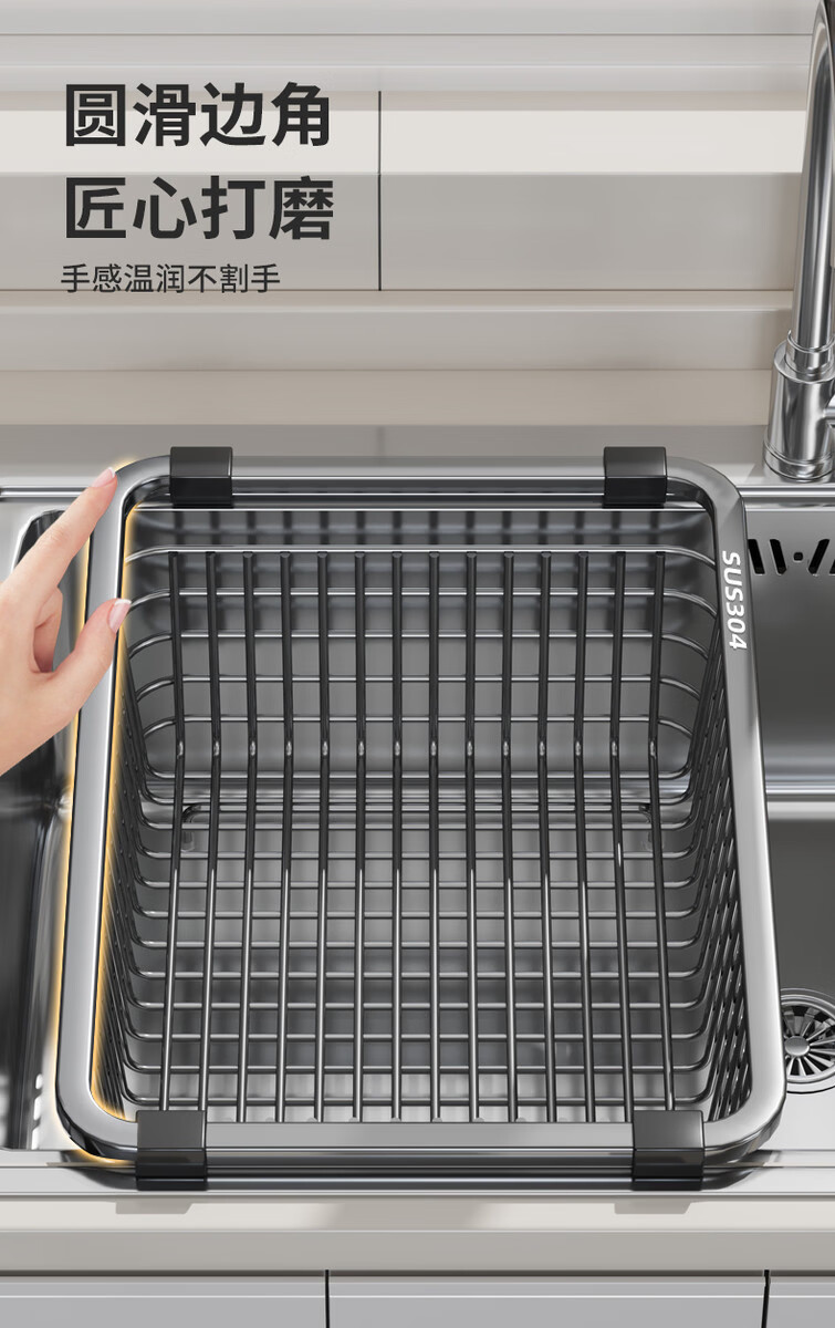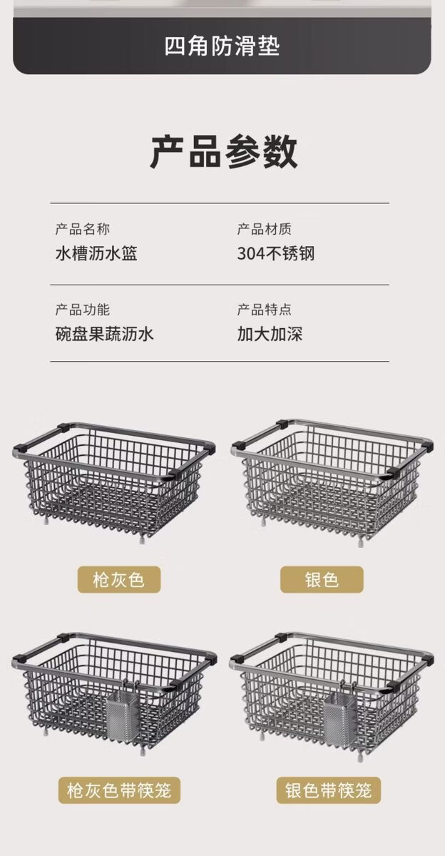 Yusenyi 304 stainless steel drain basket kitchen sink drain rack wash basin dish rack wash basin large single-slot storage rack 34 gray 304 stainless steel nano-encrypted version (applicable to the sink inner length 2
