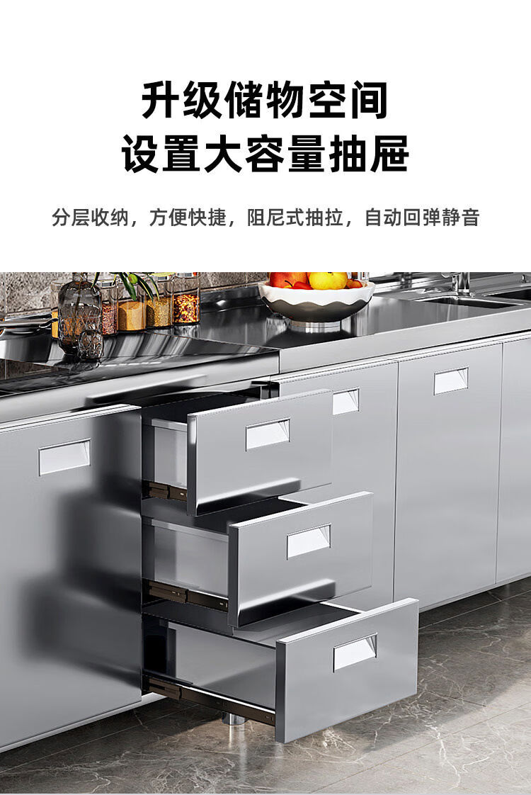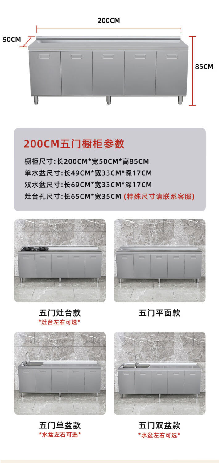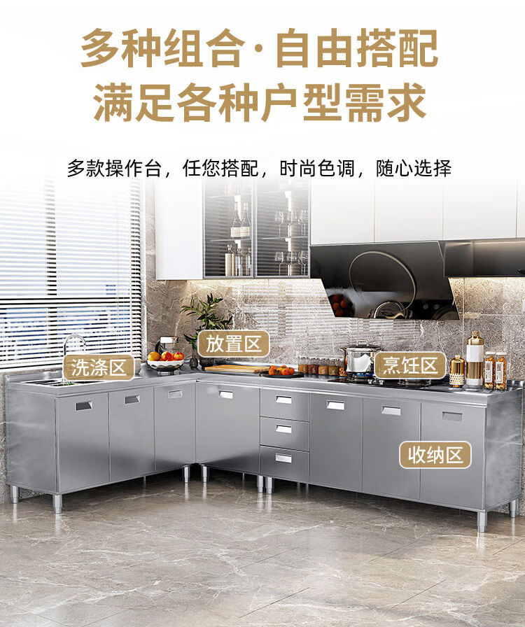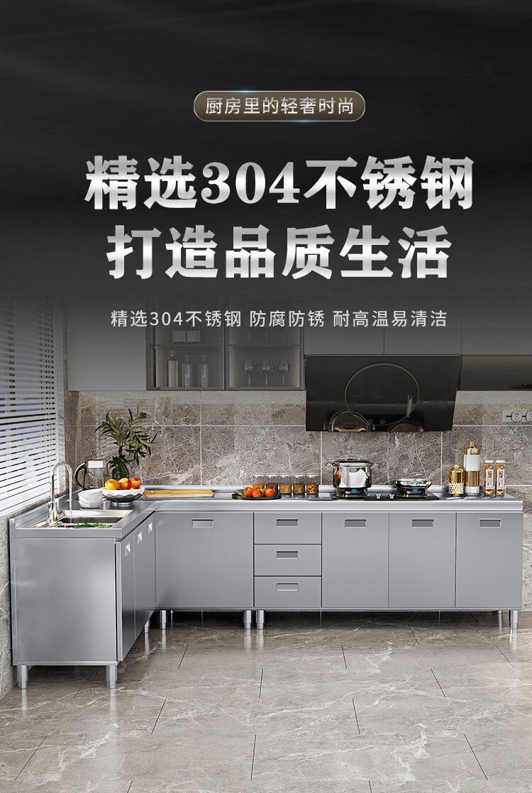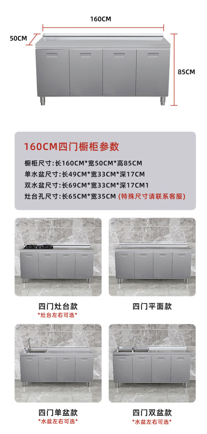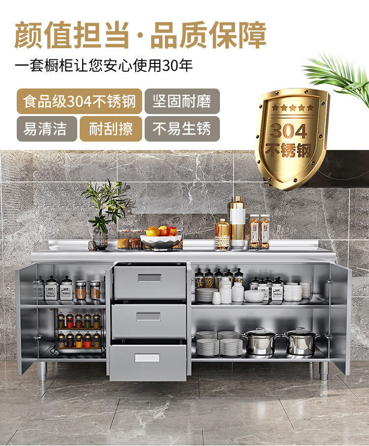 OTHER304 overall stainless steel cabinet extra thick kitchen cabinet stove cabinet integrated household sink cabinet storage cabinet cupboard flat model 304 thickened stainless steel countertop 160cm three drawers and three door model need to note left and right