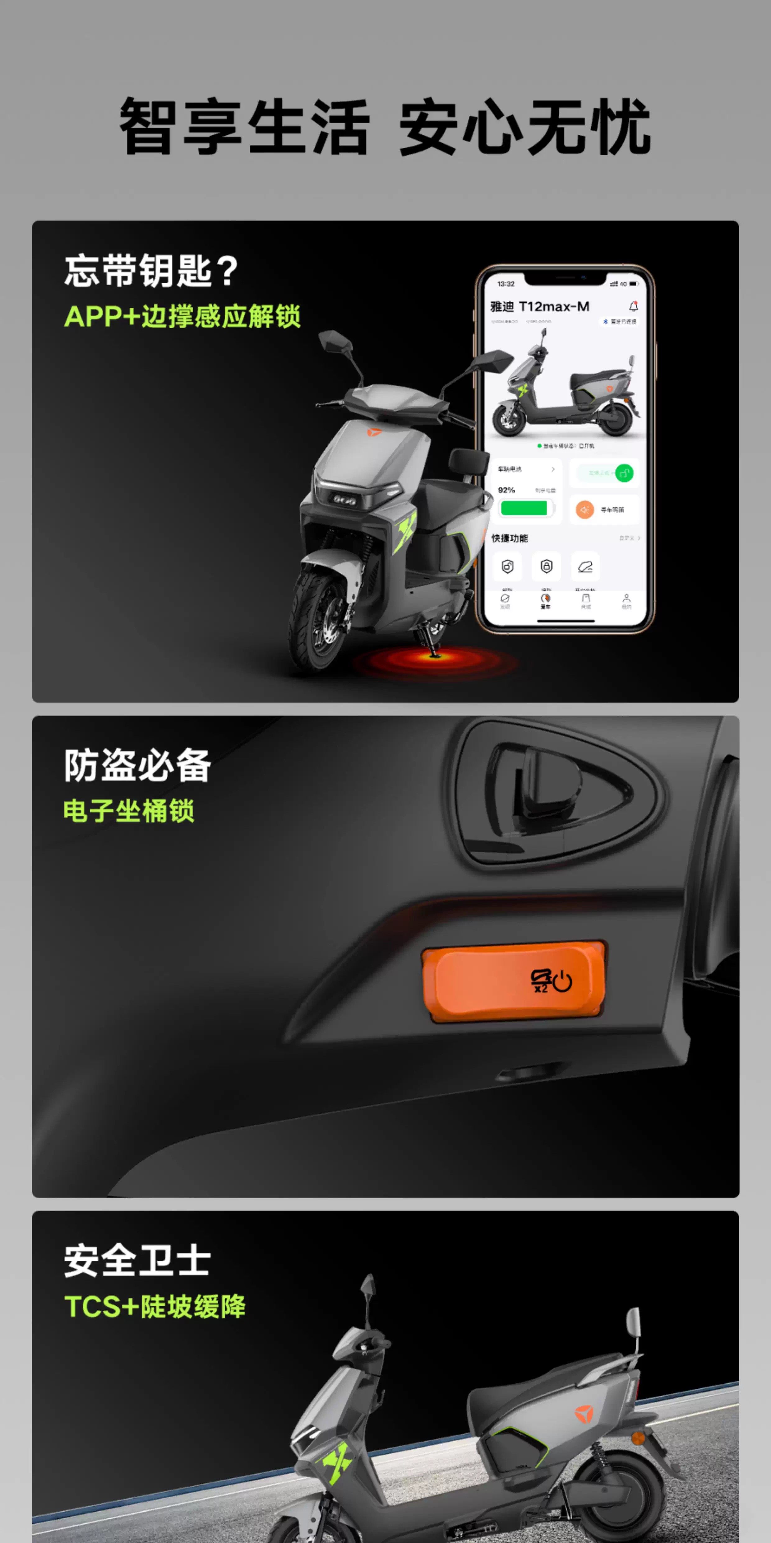 Yadi Wang Hedi recommends Yadi T12-M electric motorcycle, adult mobility scooter, long range, high-power scooter, fully intelligent, daily commuting, new model, dedicated, super long range, shark gray (1.8 meters large body + TCS snow anti-skid) 72V 23Ah (Yadi Huayu TTFAR graphene battery)