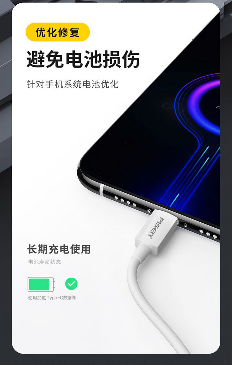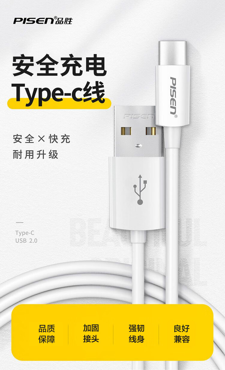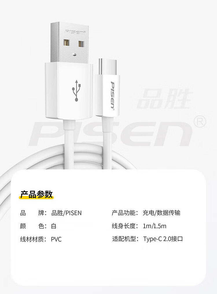 PISEN Type-c data cable charger cable is suitable for Type-c interface Huawei Xiaomi Honor vivo mobile phone fast charging USB-C mobile phone tablet car 3A fast charging Type-C cable white 1 meter