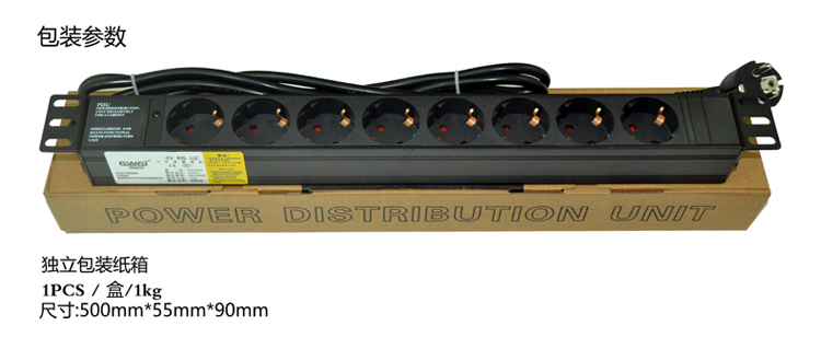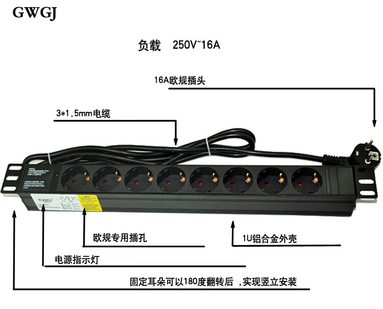 GWGJ PDU cabinet socket 8-bit European standard 16A1U19 inches with power indicator light aluminum alloy strip wiring board 3*1.5mm square 2 meters cable with European plug