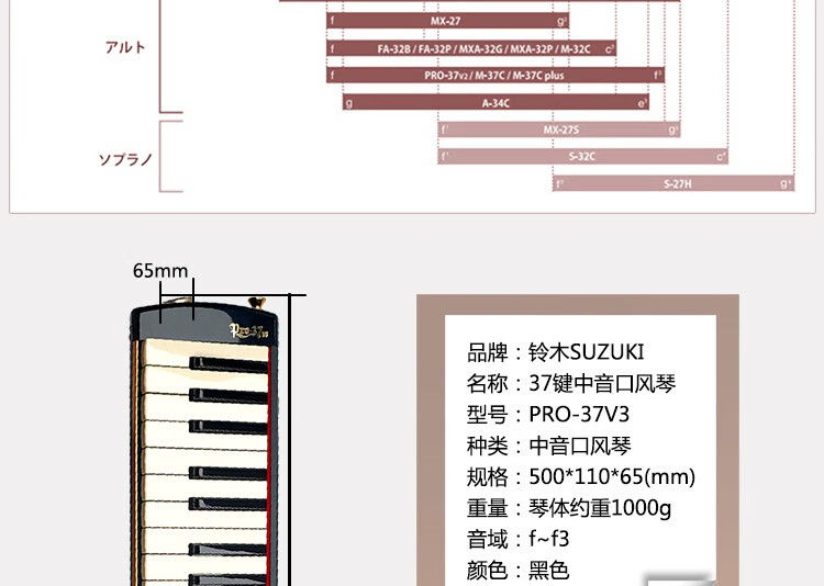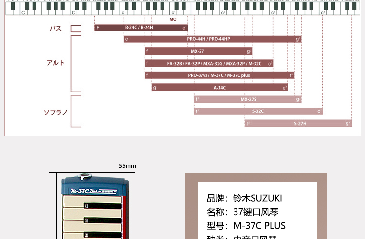 SUZUKI Japan Suzuki, special beginner professional classroom teaching for children and students, various styles of playing mouth organ, 37 keys M-37C, imported from Japan