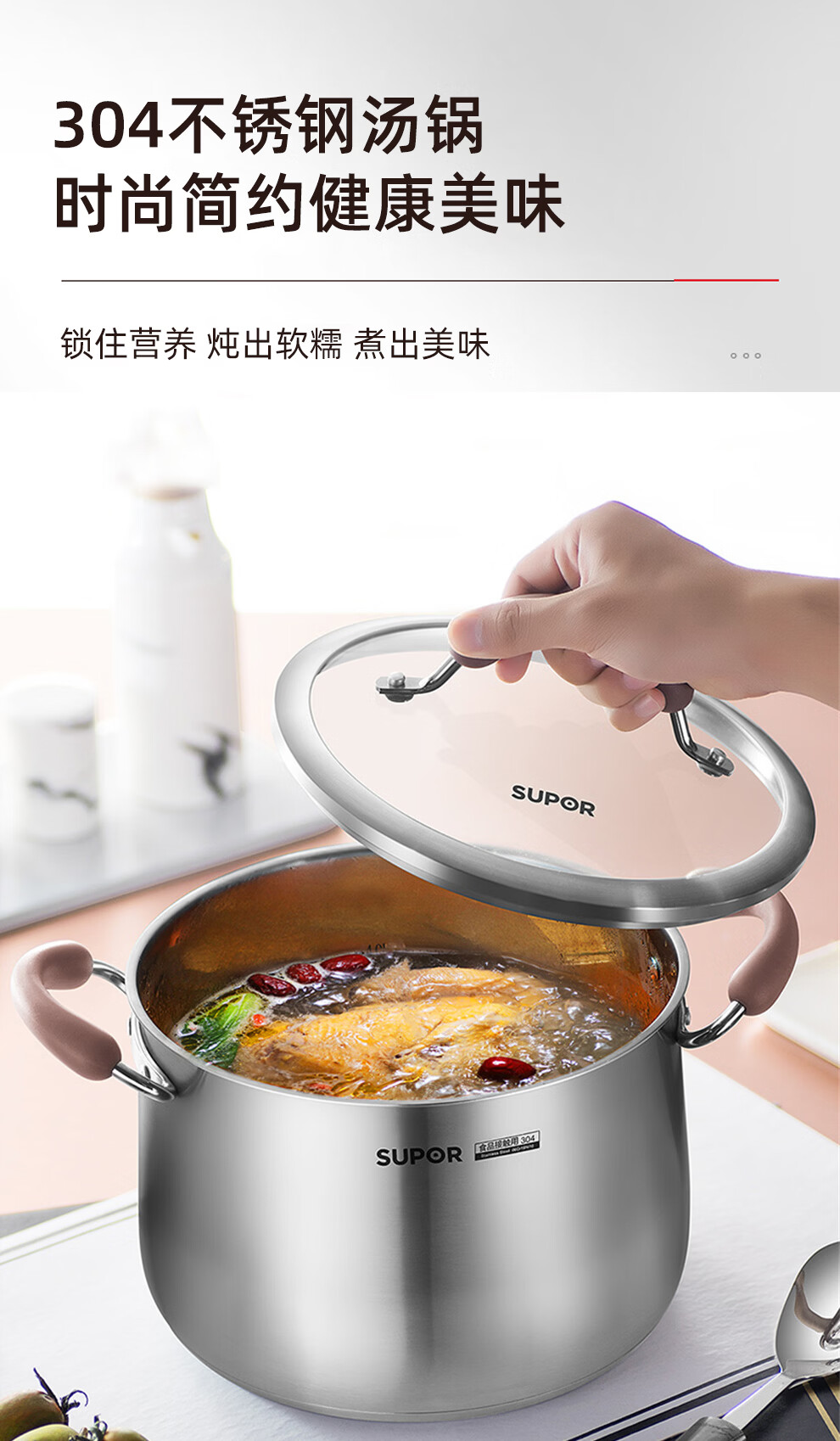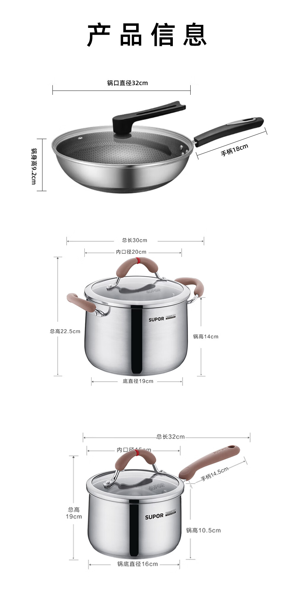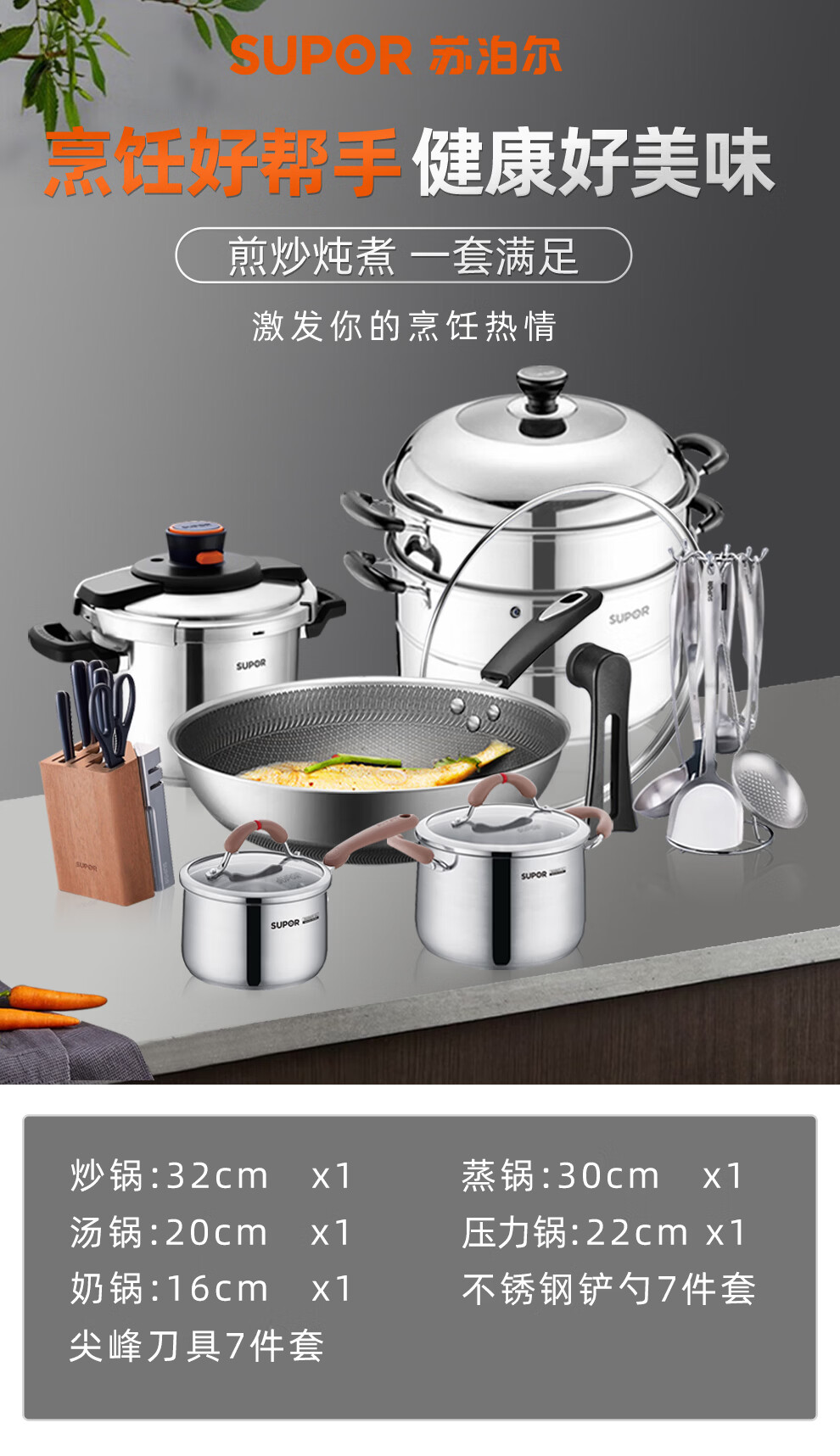 SUPOR pot combination set 32cm stainless steel wok pressure cooker steamer soup pot milk pot set knife set spatula 19-piece set stainless steel pot set