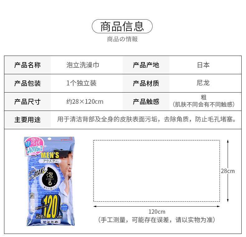 Qingyou Japan imported men's strong bath towel, bath towel, bath towel, long back rub towel QKG-009