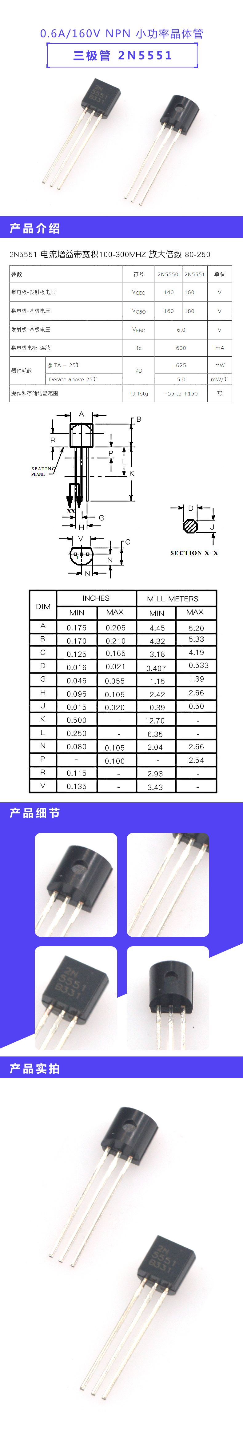 TaoTimeClub transistor 2N5551 0.6A/160V NPN low power 10 pieces
