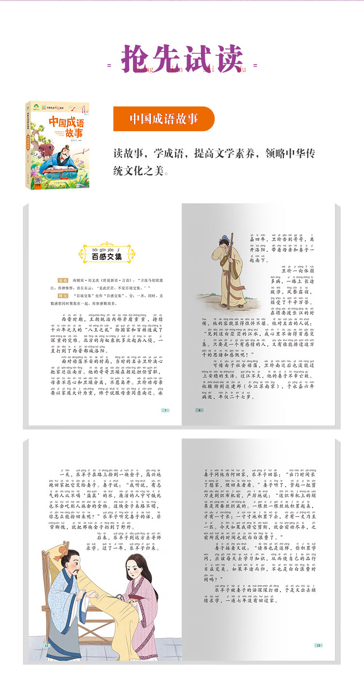 Chinese idiom stories, classic children's growth stories, picture books of growth stories for children aged 6-12, phonetic version, bedtime reading books
