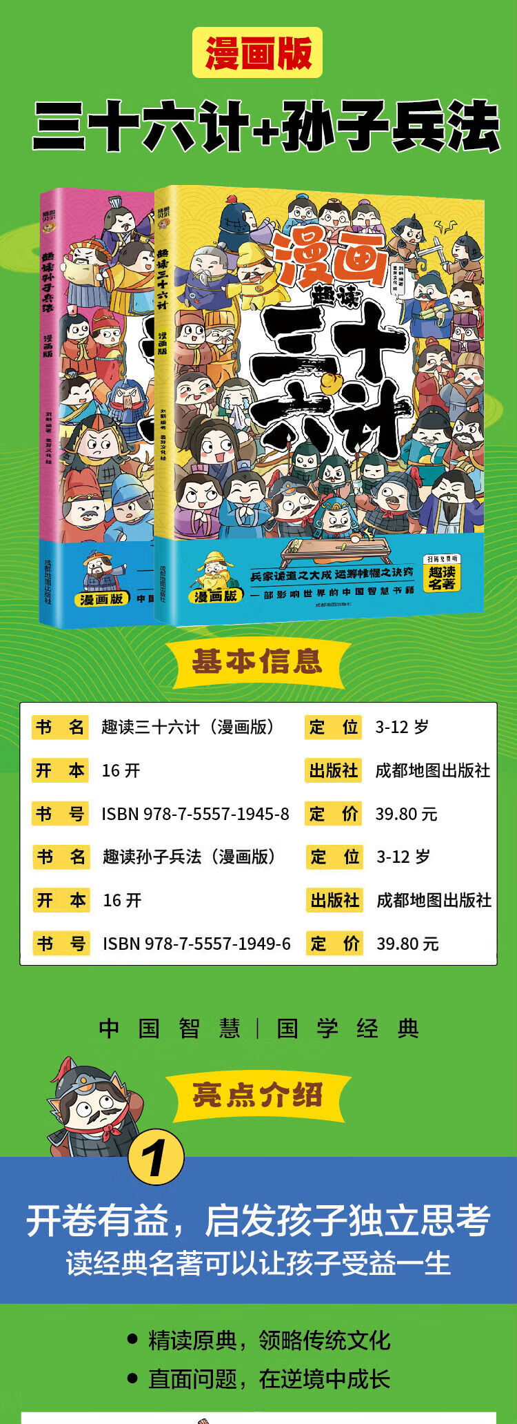 Fun Reading of Sun Tzu's Art of War + Fun Reading of Thirty-Six Stratagems, 2 volumes with color pictures and phonetic notation, children's reading comic version, primary and secondary school extracurricular reading of Chinese classics, historical children's literature comics