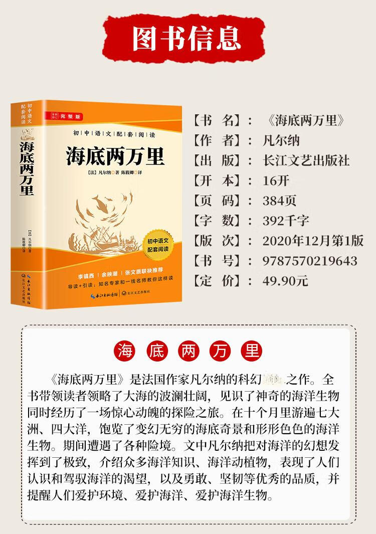 Twenty Thousand Leagues Under the Sea is a must-read masterpiece for seventh graders in the second volume. The complete version is a companion reading to the junior high school Chinese Humanities Education Edition textbook and comes with a reading core test manual.
