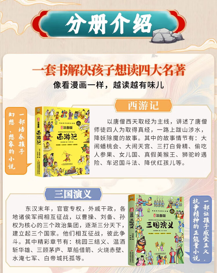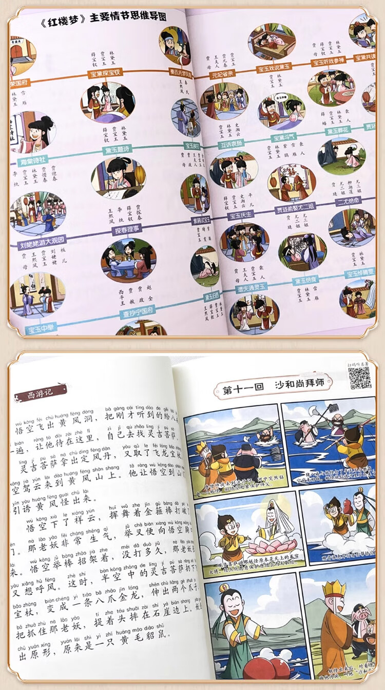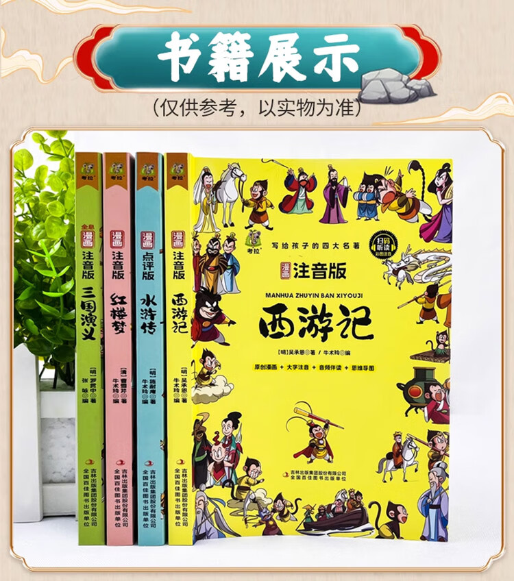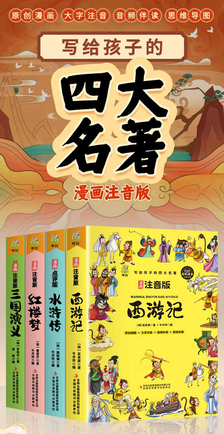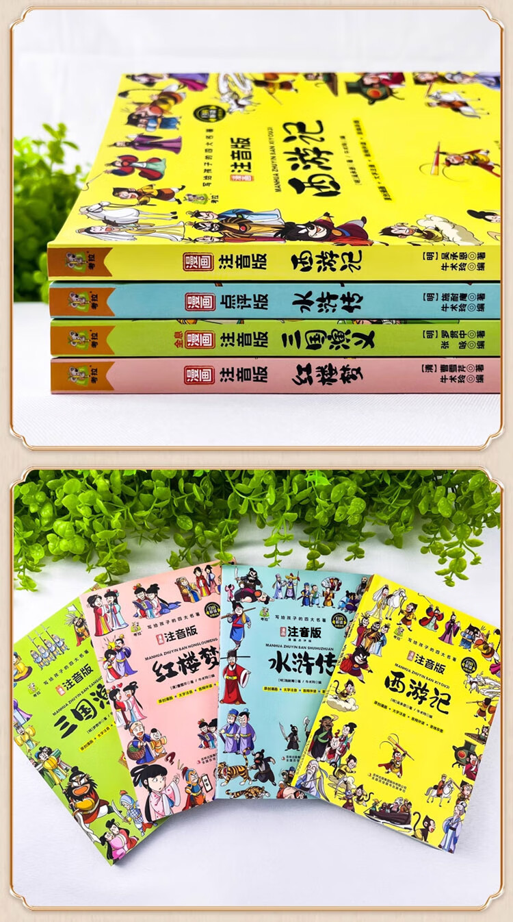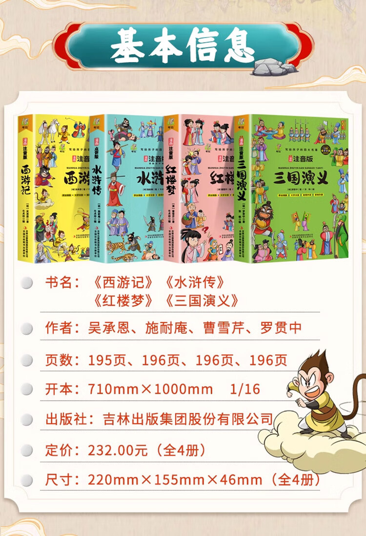 Primary school student editions of the Four Great Classics: Journey to the West, Water Margin, Dream of Red Mansions, and Romance of the Three Kingdoms. Comic phonetic version of the Four Great Classics for children. Original comics. Phonetic notation of large characters. Audio accompanying reading. Mind map version with audio accompanying reading. Children's literature extracurricular reading books. One-to-two transition. Primary to primary education transition.