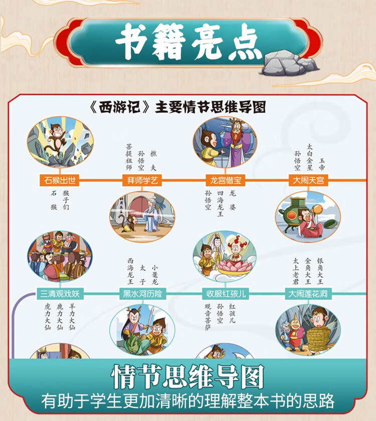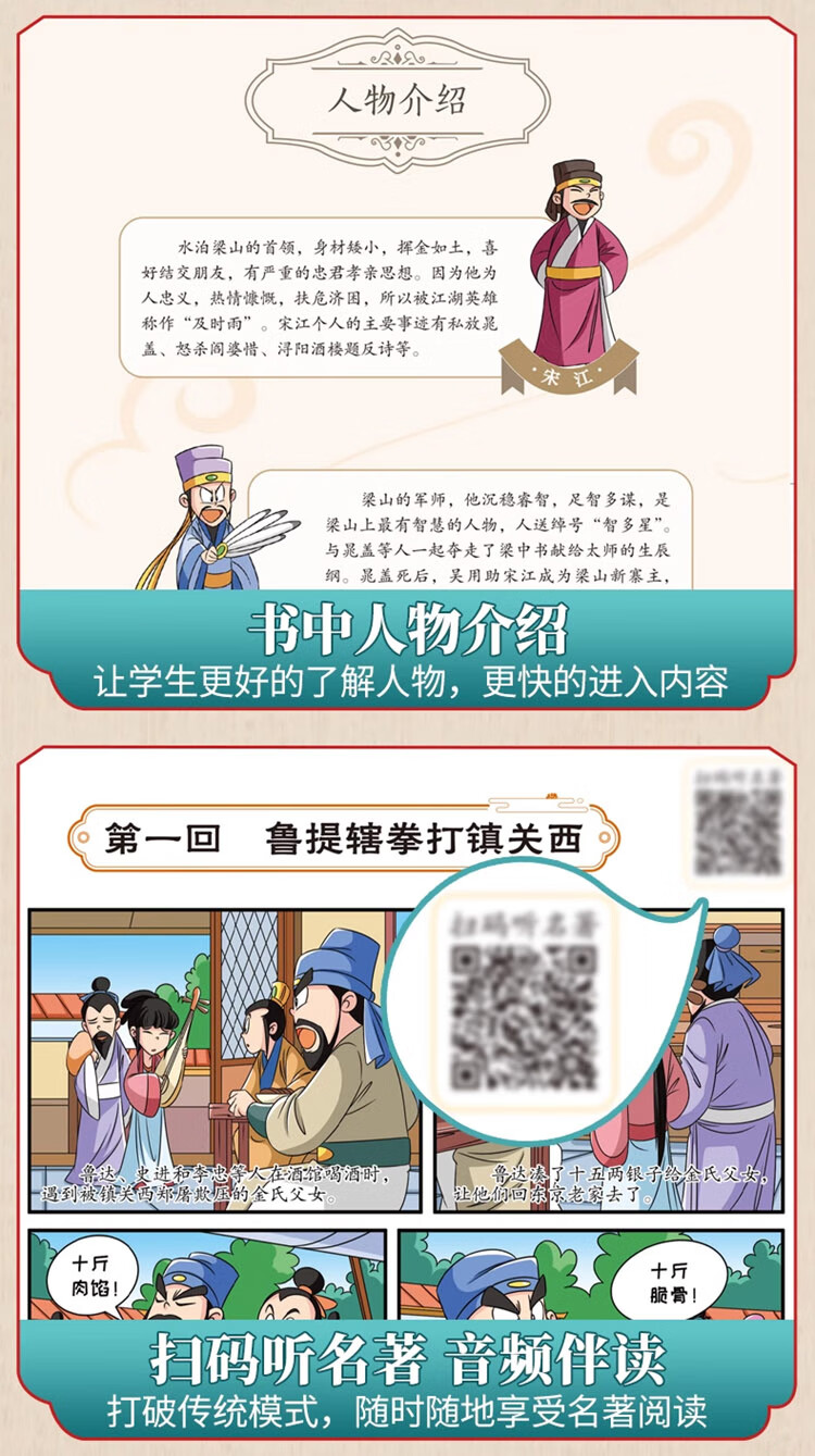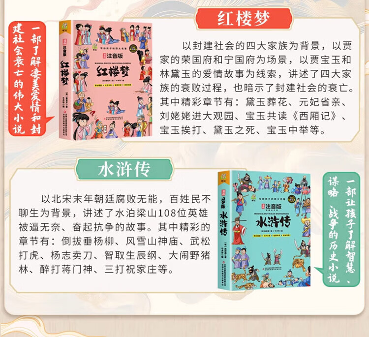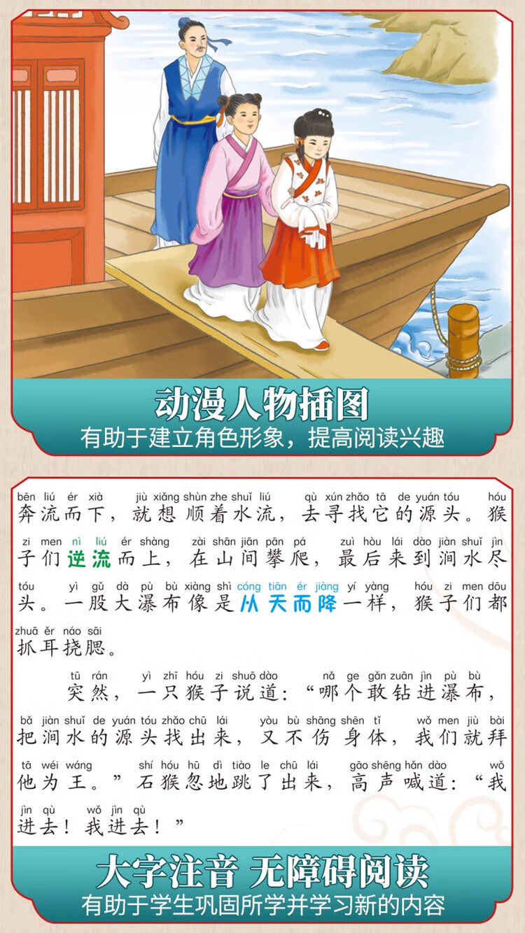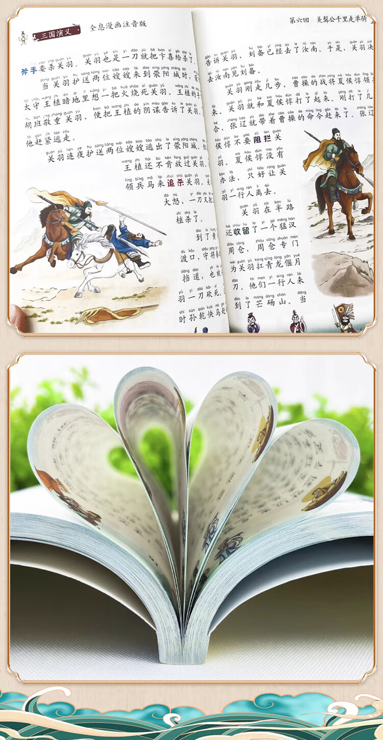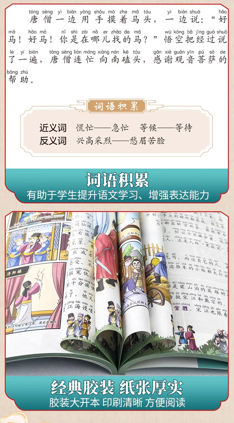 Primary school student editions of the Four Great Classics: Journey to the West, Water Margin, Dream of Red Mansions, and Romance of the Three Kingdoms. Comic phonetic version of the Four Great Classics for children. Original comics. Phonetic notation of large characters. Audio accompanying reading. Mind map version with audio accompanying reading. Children's literature extracurricular reading books. One-to-two transition. Primary to primary education transition.