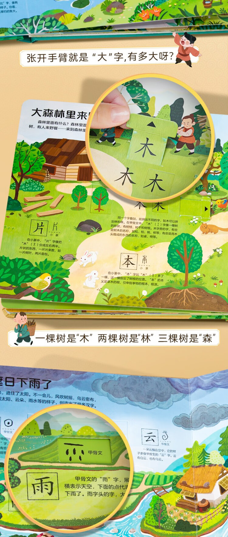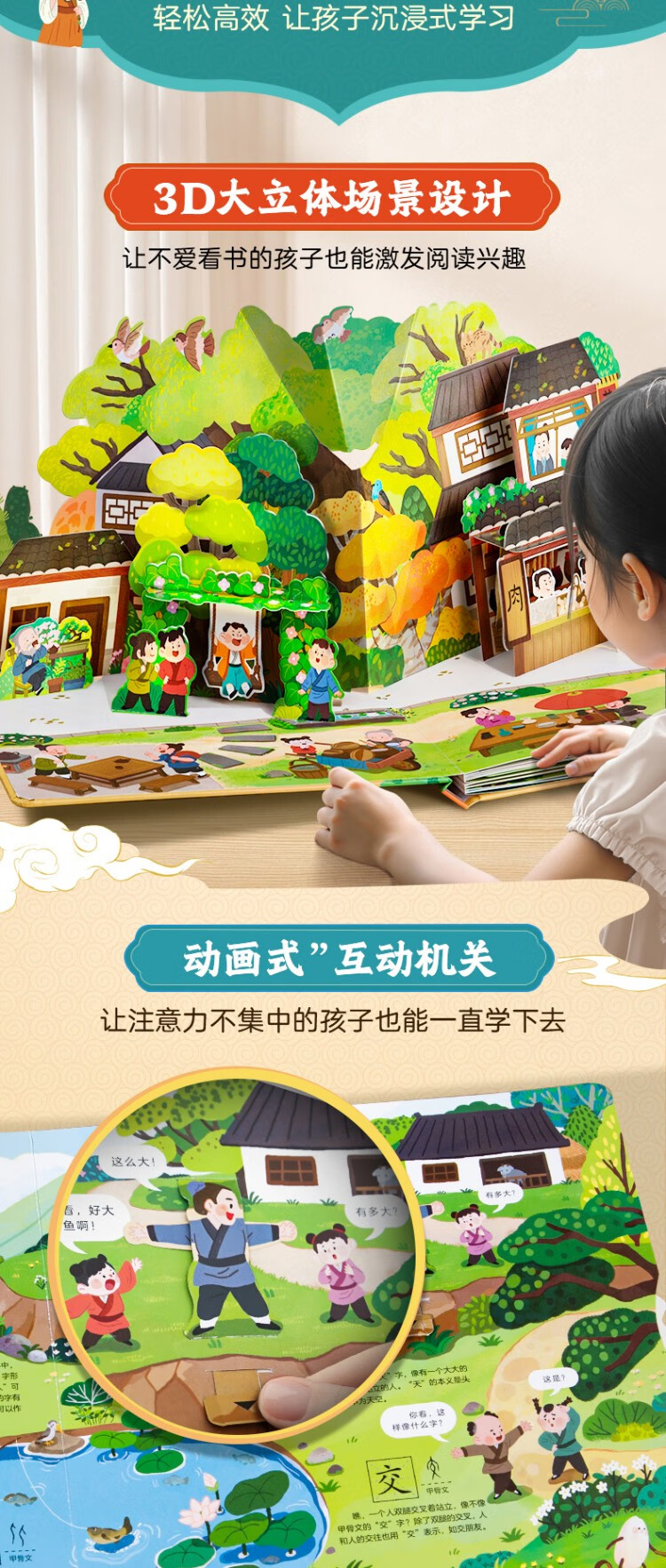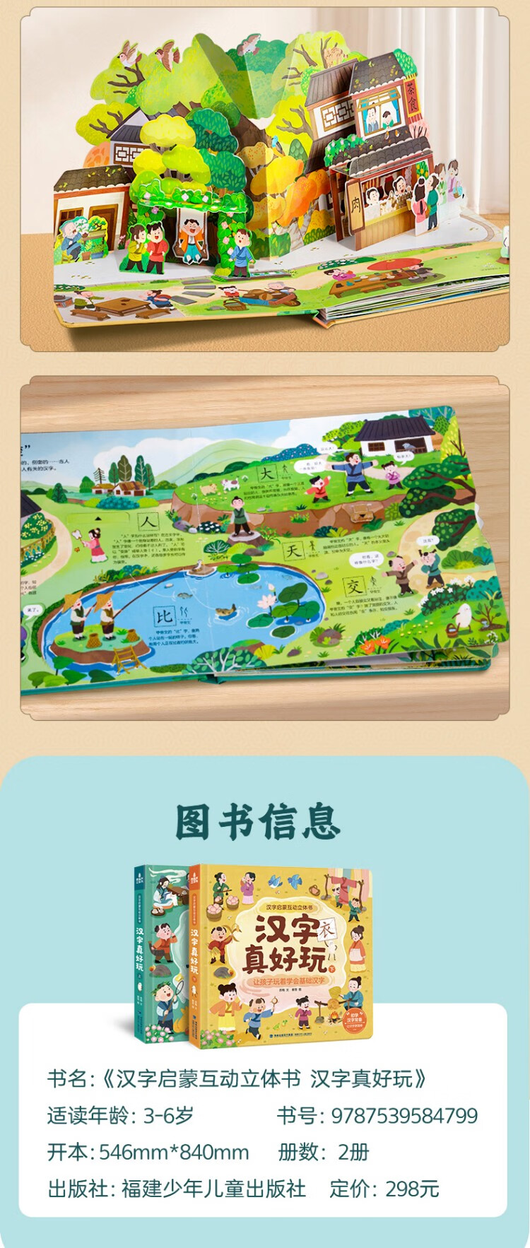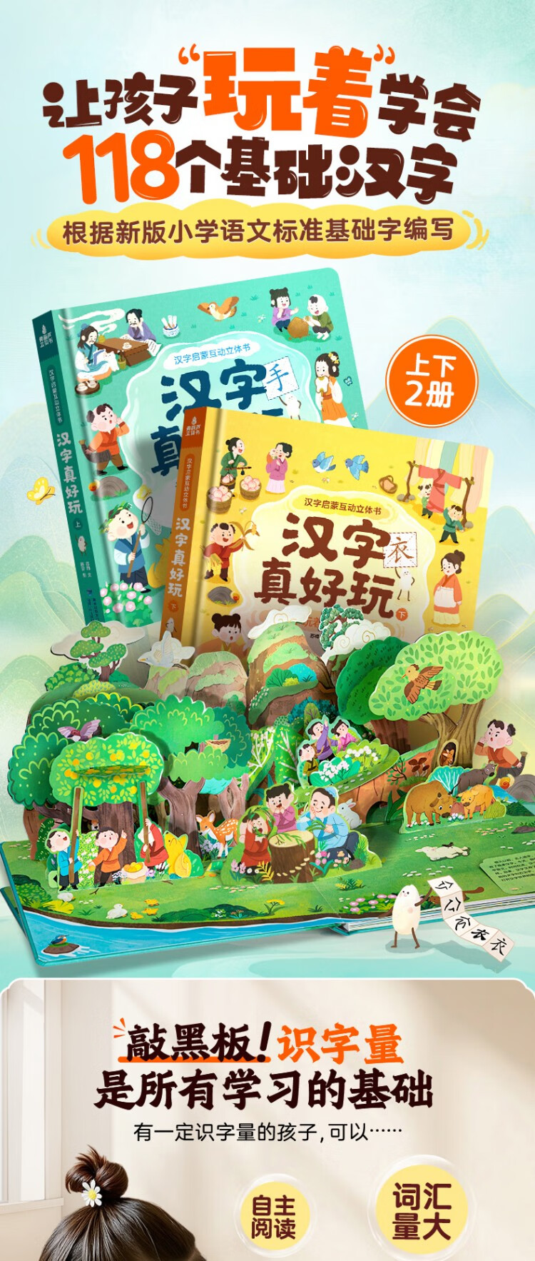 Chinese characters are really fun, enlightenment interactive three-dimensional book, a complete set of 2 volumes, children's 3D three-dimensional book flip book, 3-6-8 years old baby's young connection to preschool literacy artifact, Green Hulu