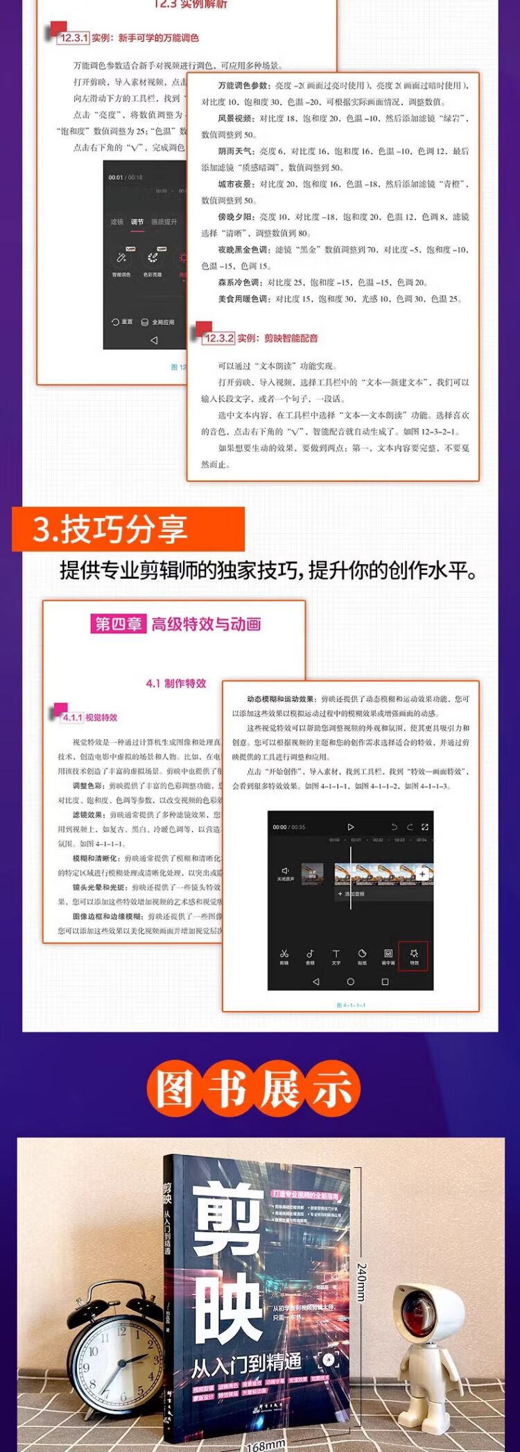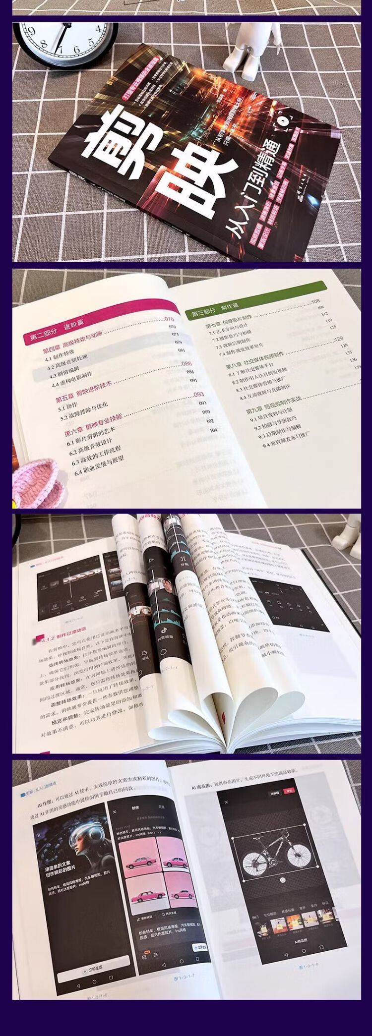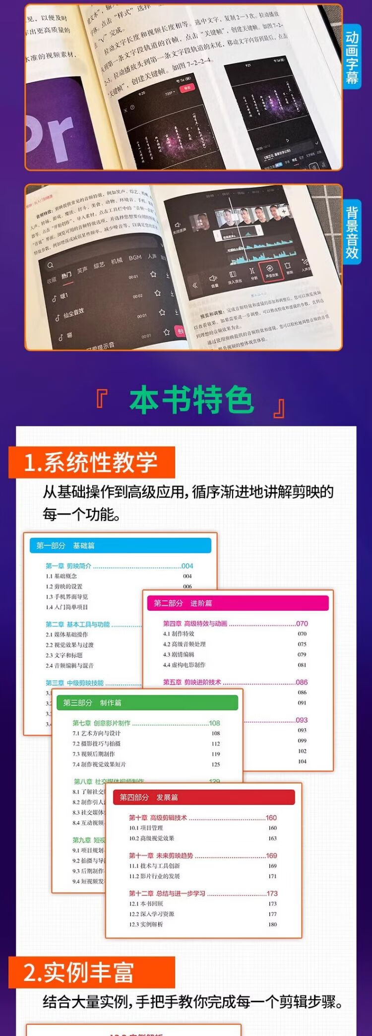 3 volumes in total, editing and screening, from entry to proficiency + mobile photography, from entry to proficiency + igniting traffic, easily creating popular short videos, shooting techniques, video editing tutorials, filter, color, and matting techniques, masking special effects, transitions, keyframe animations, fun with short video content marketing celebrity mode