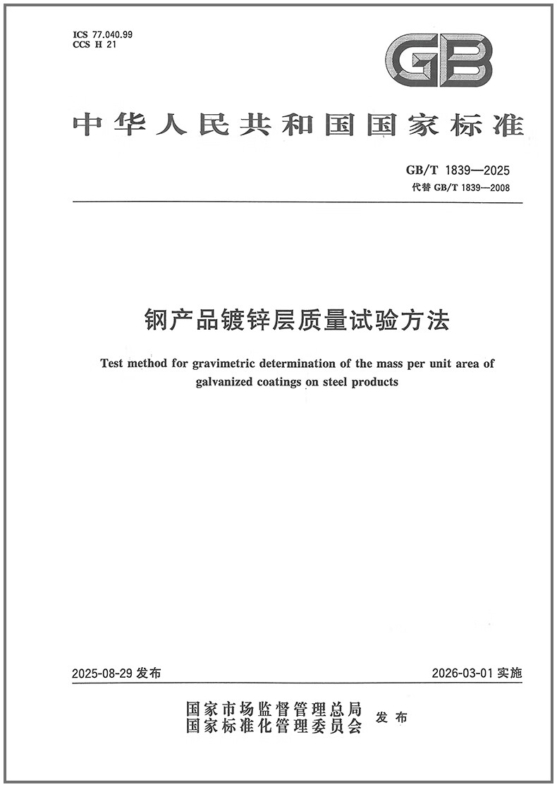 GB/T 1839-2025 Test method for quality of galvanized layer of steel products