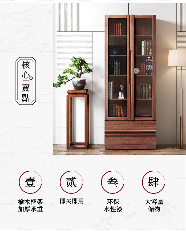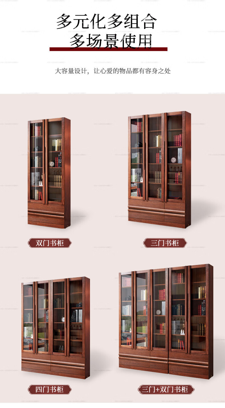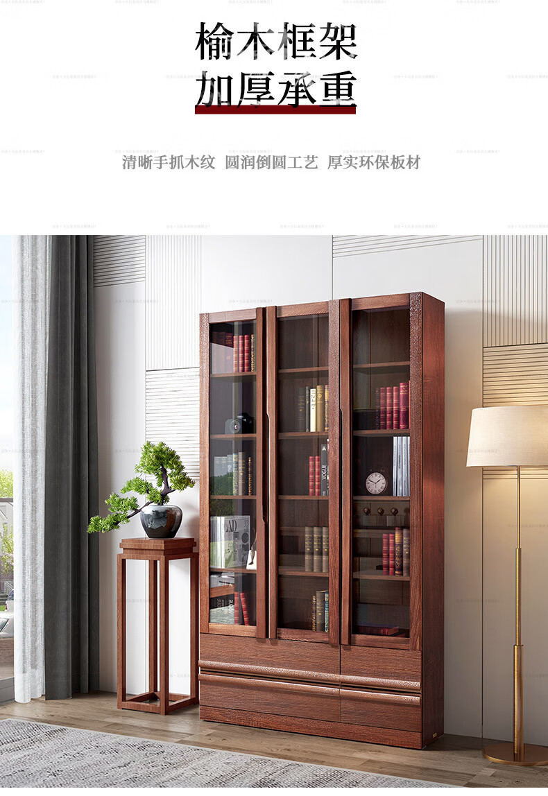 Tiantan furniture bookcase, environmentally friendly solid wood elm board wood combination bookcase, glass door bookcase, modern new Chinese style bookcase, three doors, length 1190mm, width 325mm, height 2100mm