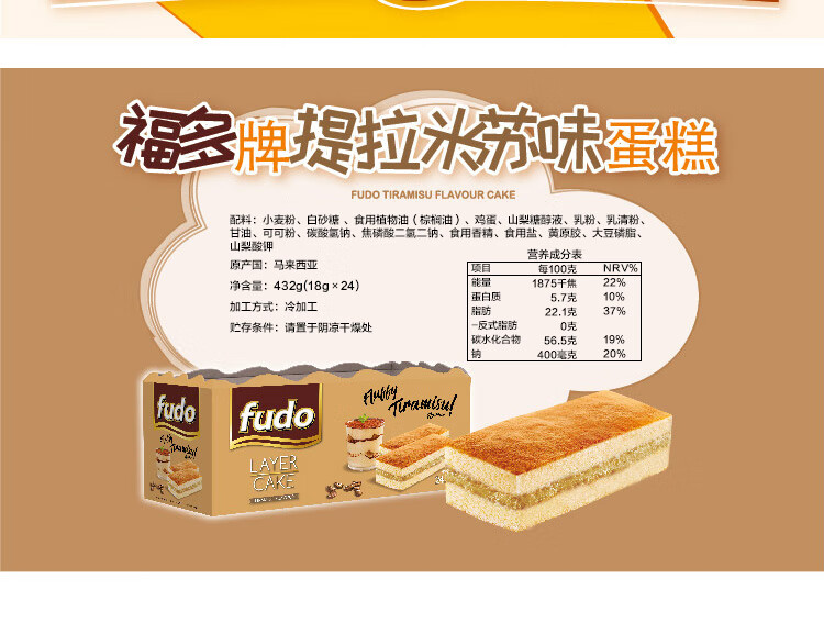 Fudo Tiramisu Cake 432g (individually packaged 24 pieces) imported from Malaysia, zero trans fat