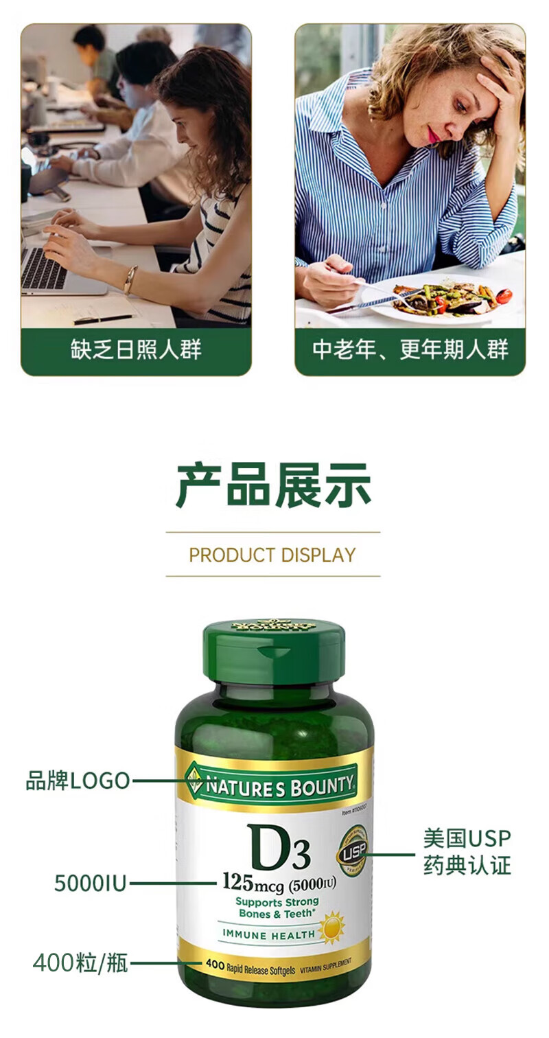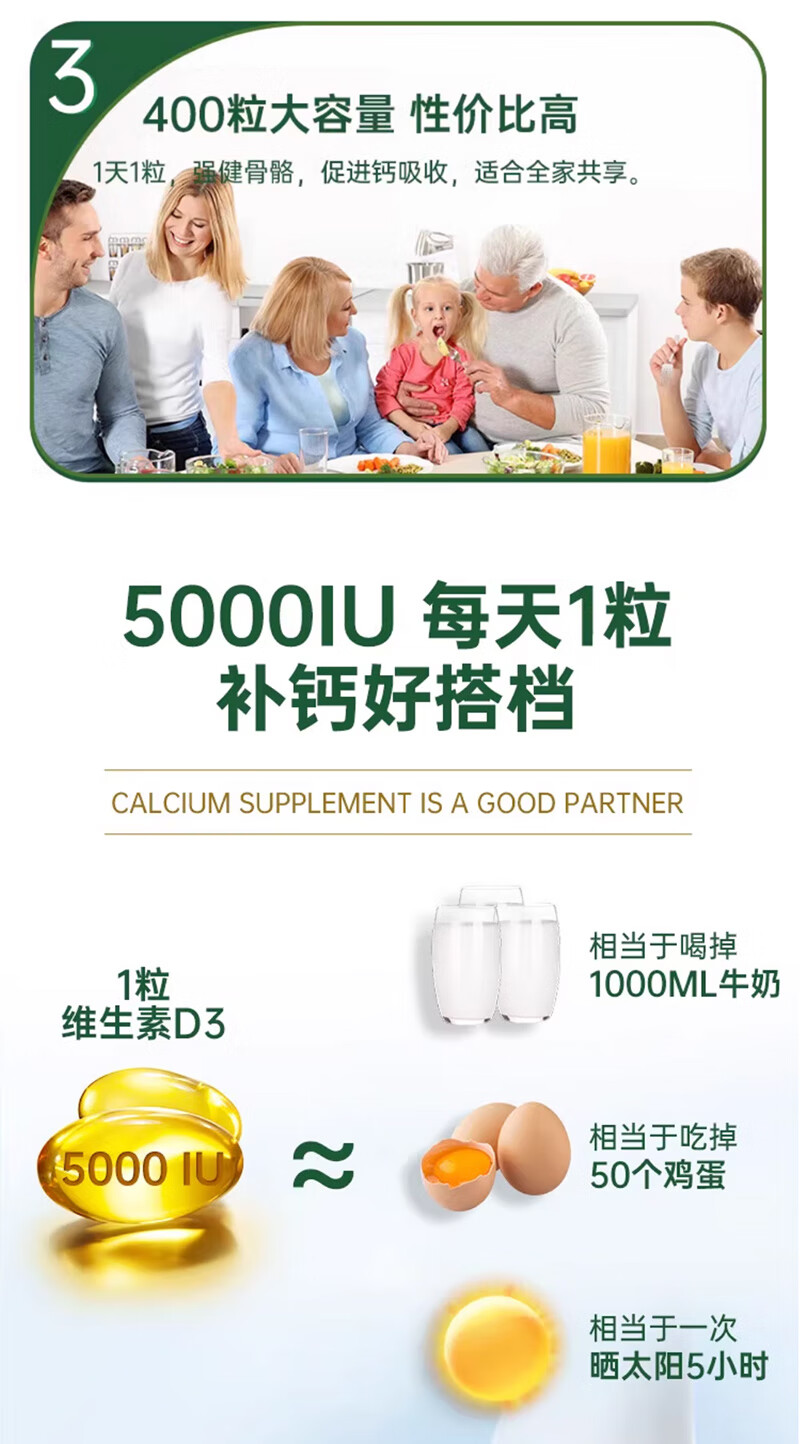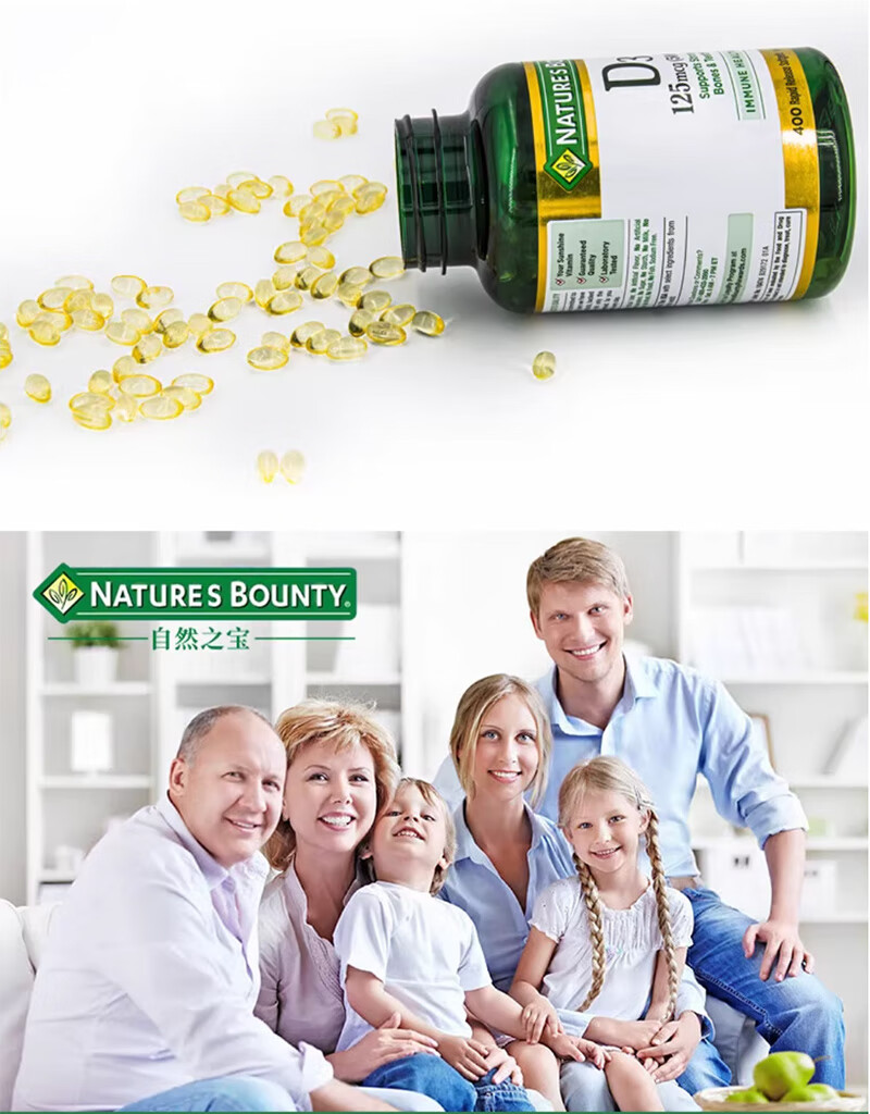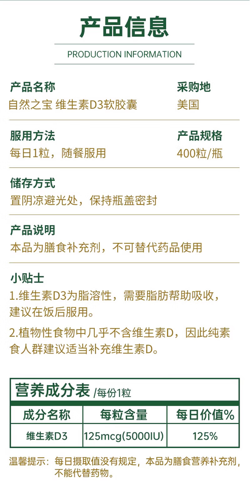 Nature's Treasure Vitamin D3 imported from the Sunshine Bottle 5000IU 400 capsules, calcium supplement for middle-aged and elderly adults to promote calcium absorption 400 capsules * 1 bottle imported from the United States