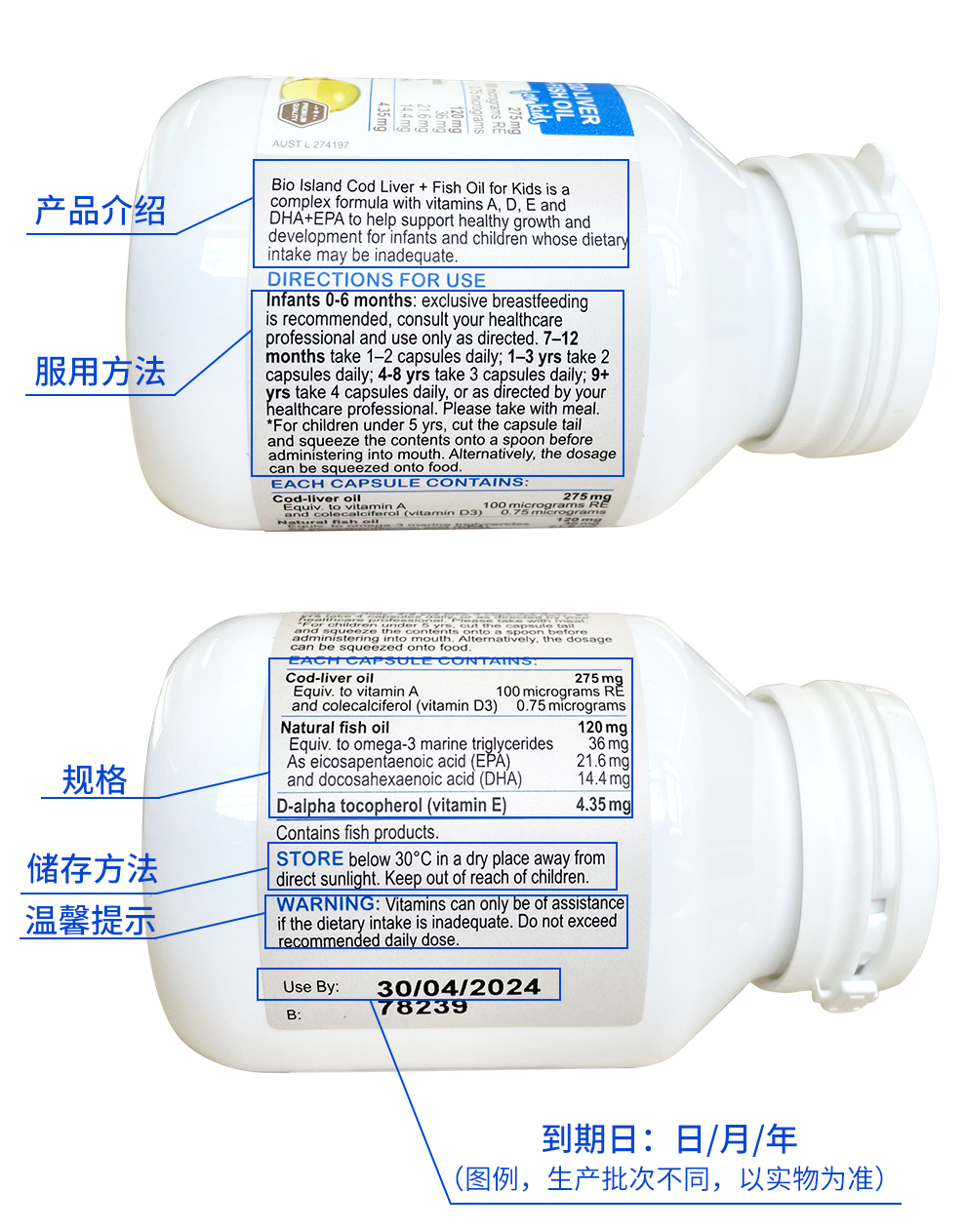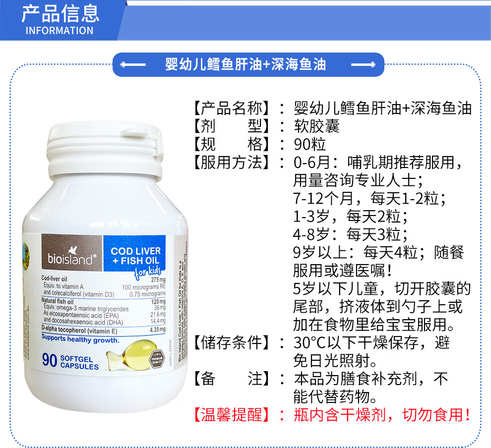 Bio Island children's cod liver oil capsules 90 capsules imported from Australia for infants and young children baby DHA