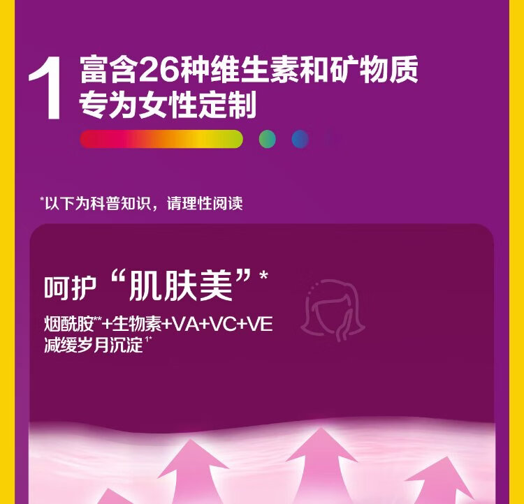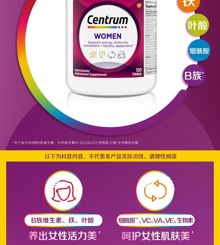 Centrum Overseas Women's Multivitamin B Complex ACDE Folic Acid Niacinamide Supplement Iron and Complexion 120 Tablets/Bottle