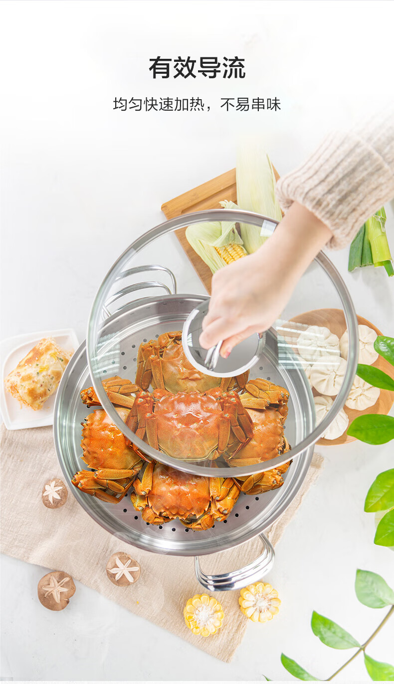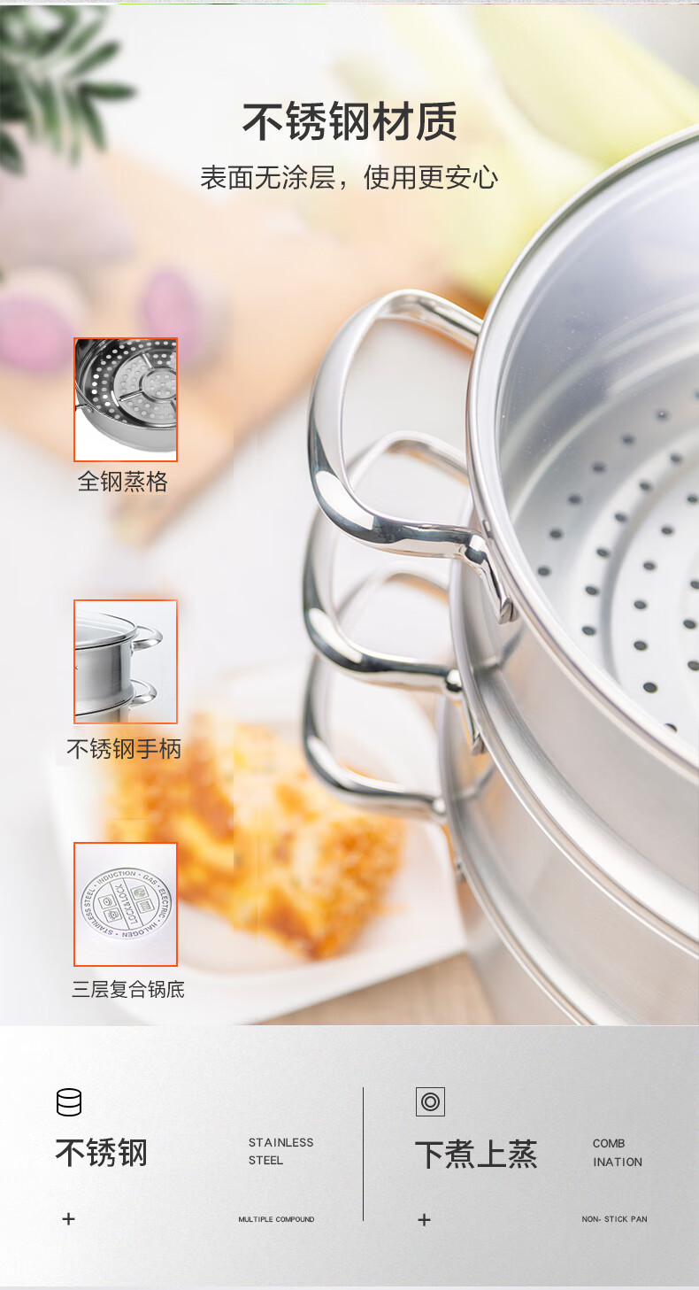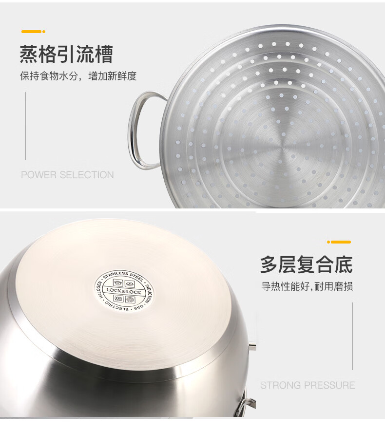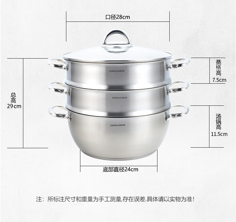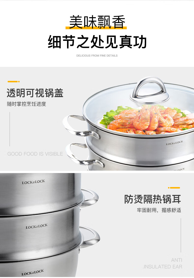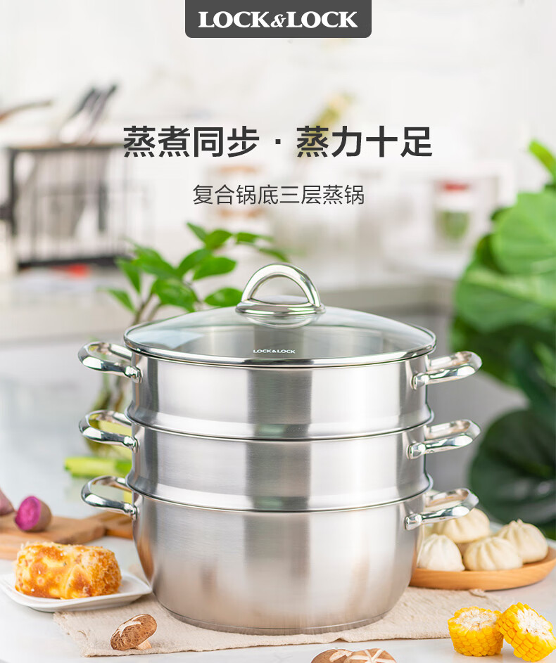 LOCK & LOCK stainless steel steamer household large-capacity steamer 28CM three-layer combination set can steam meat, fish, steamed buns and steamed buns