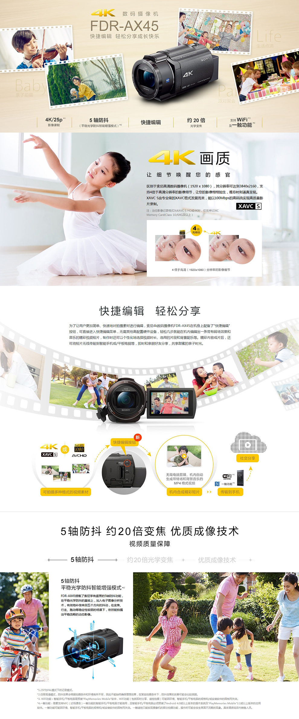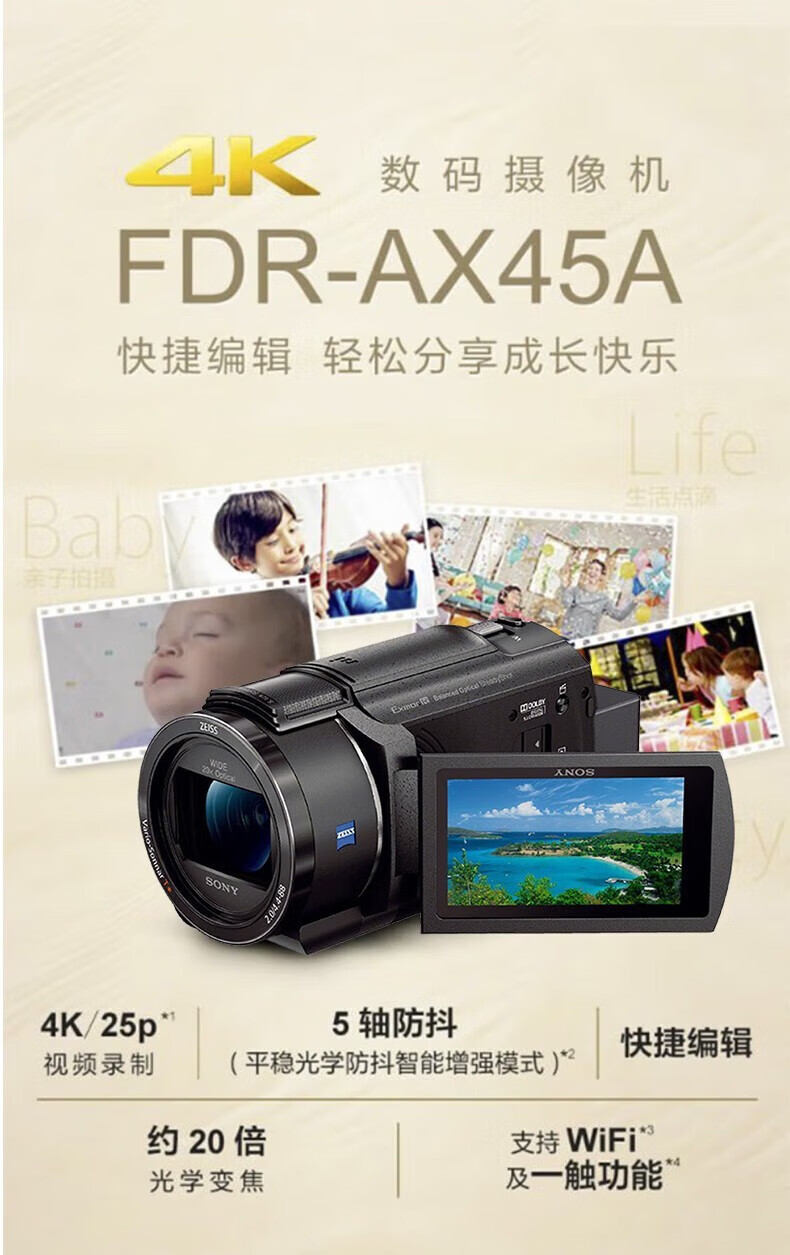 Sony (SONY) FDR-AX45A 4K digital high-definition camera, concert home teaching conference live broadcast camera, portable Vlog handheld DV player, Sony AX45A official standard (body memory 64G)