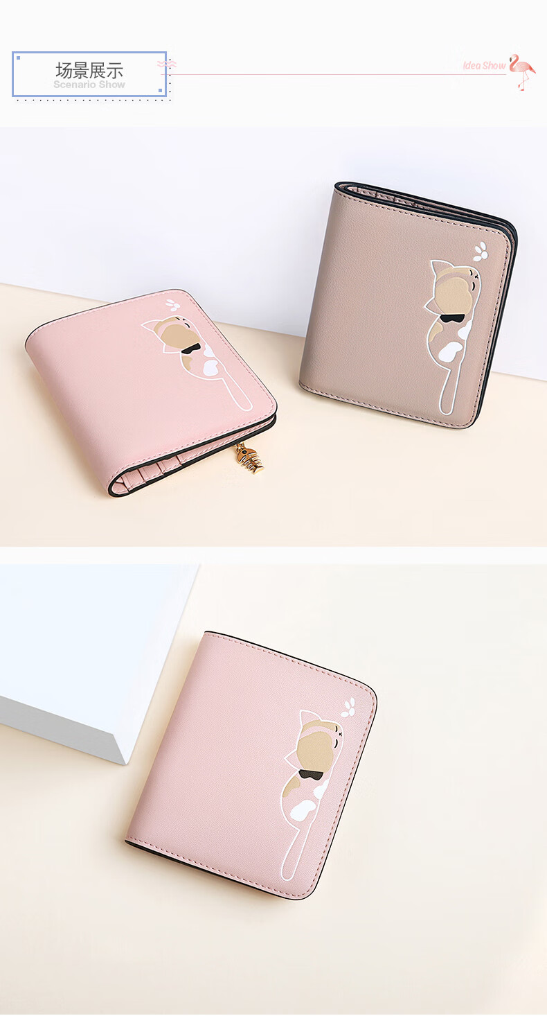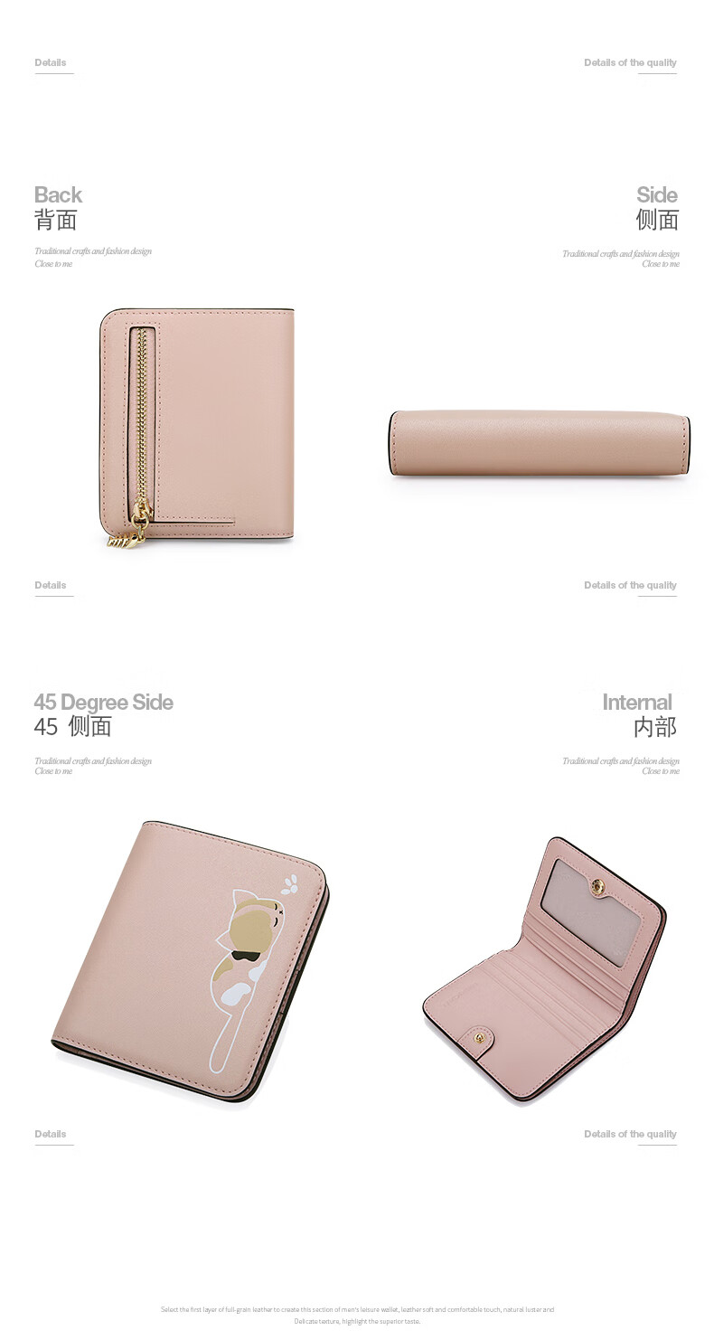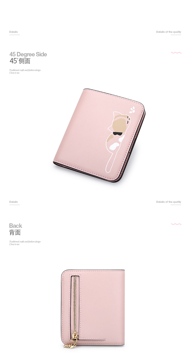 Scarecrow Wallet Women's Short Genuine Leather New Cowhide Women's Coin Purse Built-in Zipper Folding Small Wallet Cat Coin Bag Pink 10.5*2*9cm