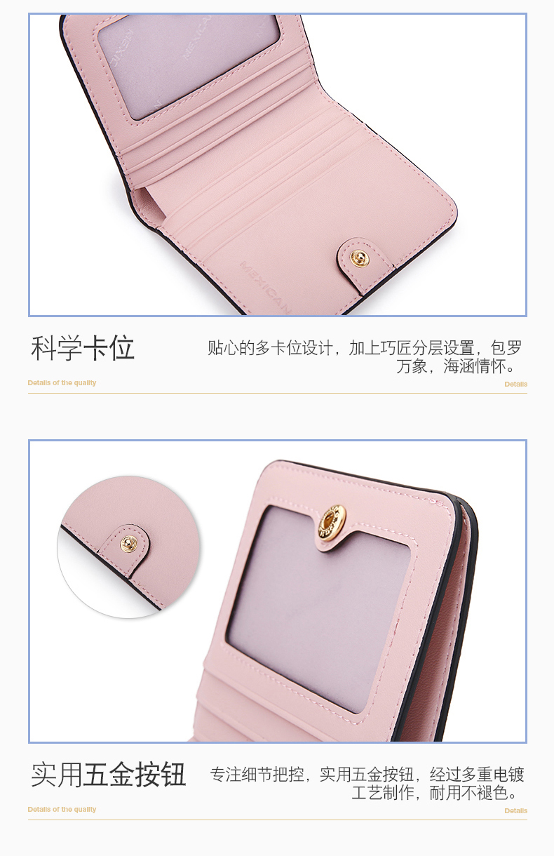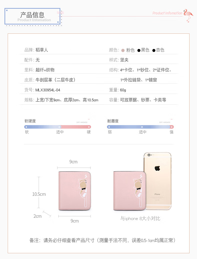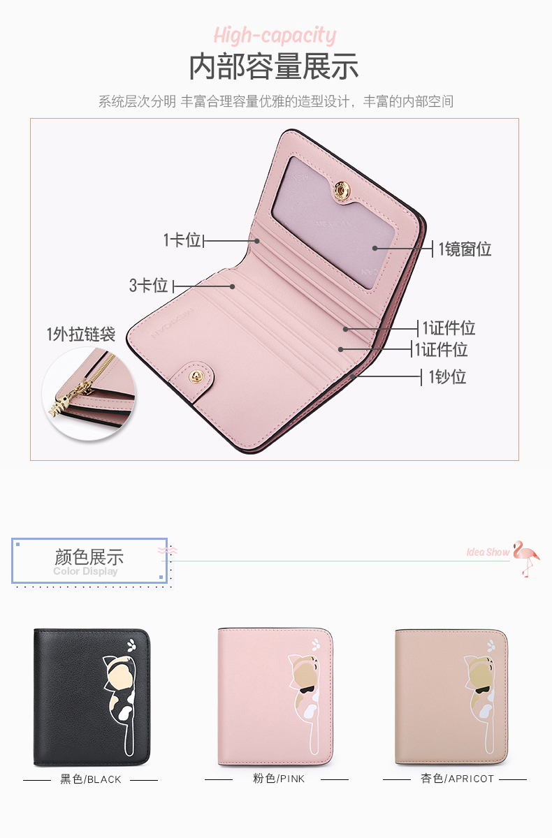 Scarecrow Wallet Women's Short Genuine Leather New Cowhide Women's Coin Purse Built-in Zipper Folding Small Wallet Cat Coin Bag Pink 10.5*2*9cm