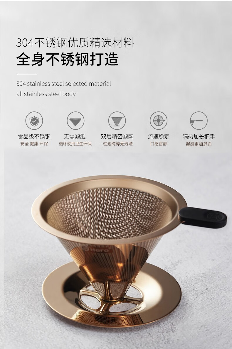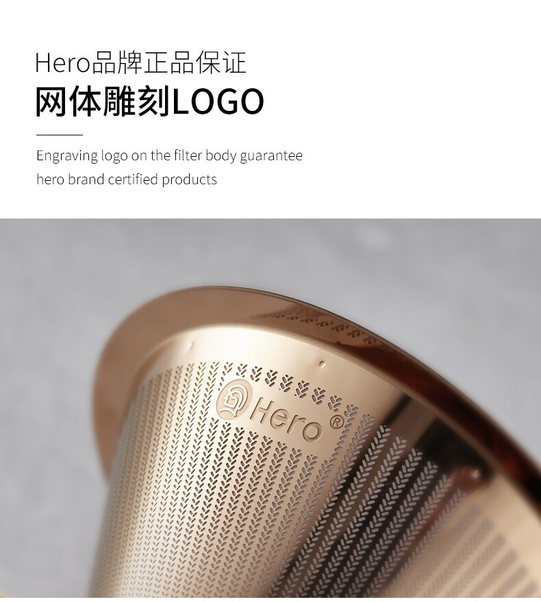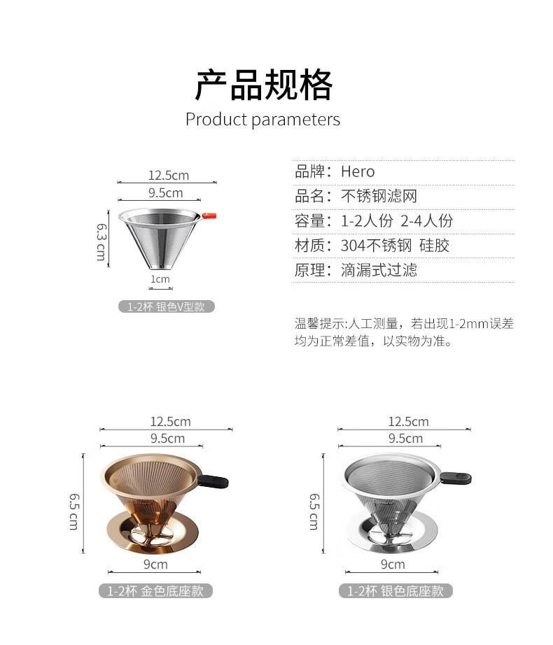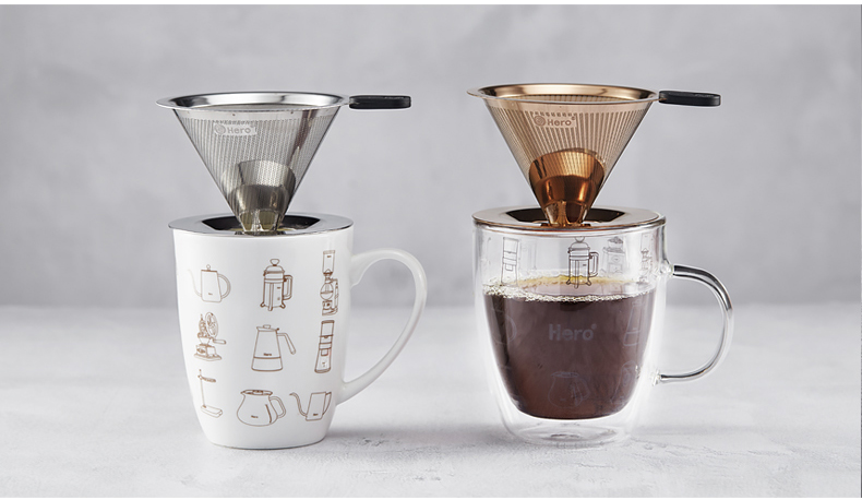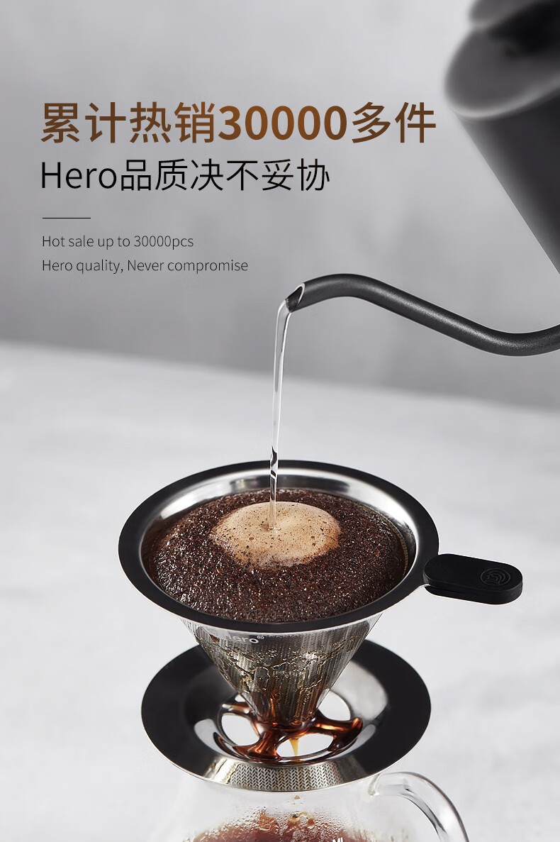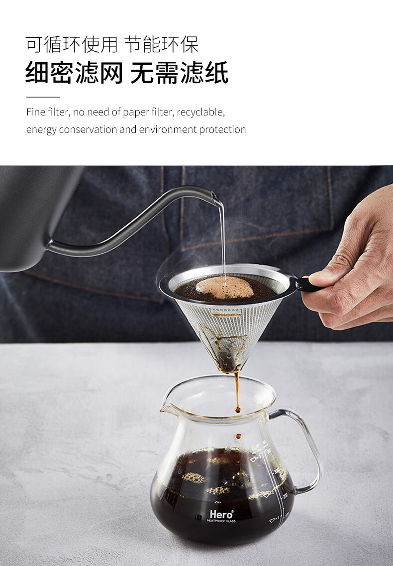 Hero coffee filter, double-layer 304 stainless steel filter, filter cup funnel, filter paper-free hand-brewed coffee pot set, silver 1-2 cups-base model