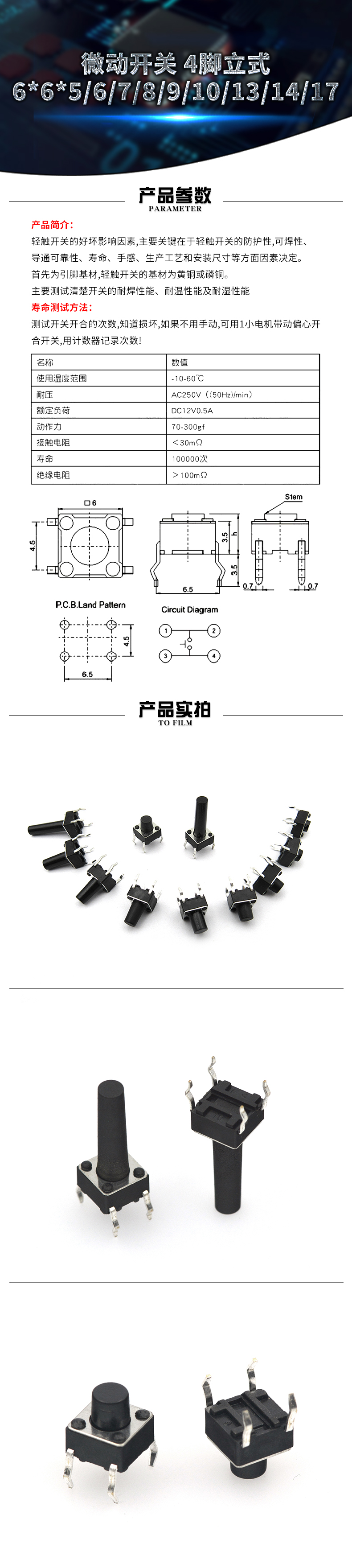 TaoTimeClub 6*6 micro switch key switch tactile switch 4-leg vertical 6*6*4.3 (50 pcs)