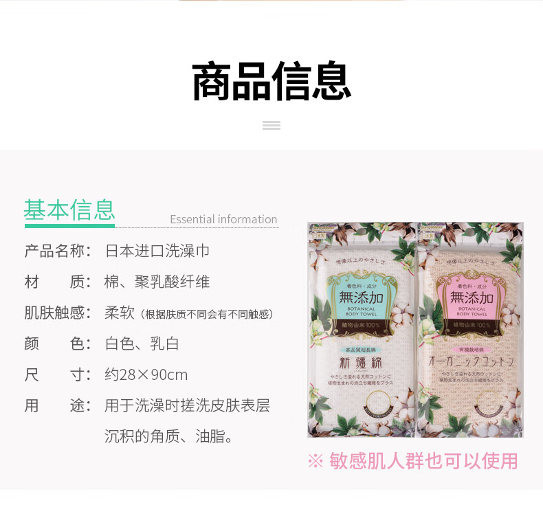 Qingyou Japan imported women's bath towel adult long back rub cloth for sensitive skin soft bath cloth back strip rub bath QYS-009 (plain skin)