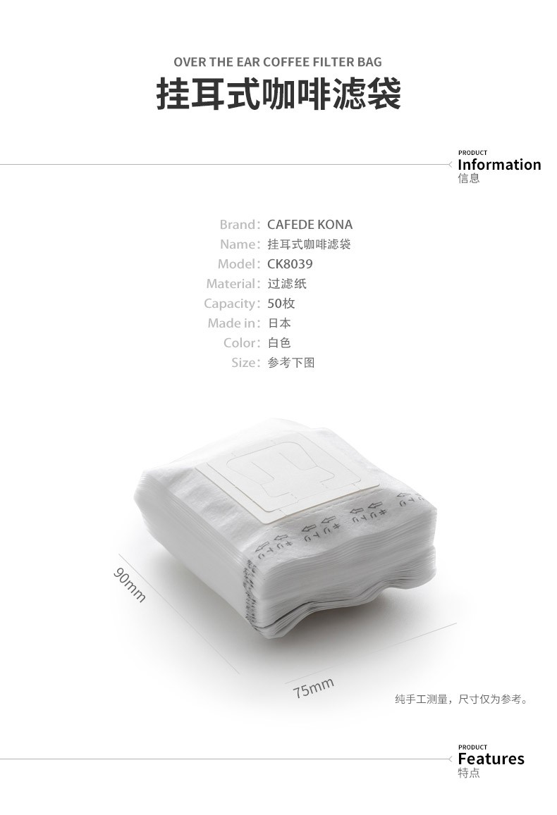 CAFEDE KONA hanging ear coffee filter bag hand brewing ear hanging filter paper hanging ear coffee packaging 50 pieces imported from Japan