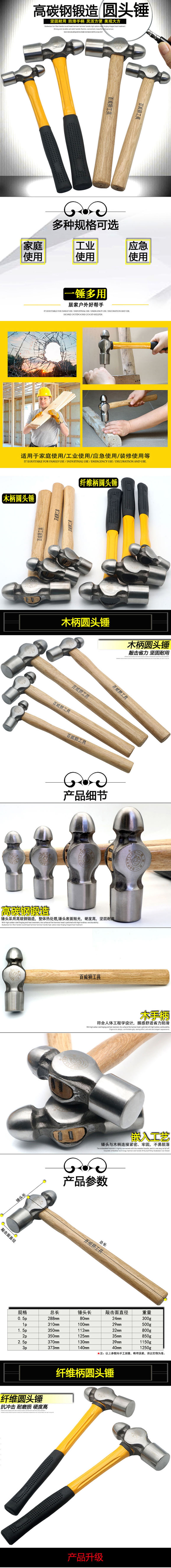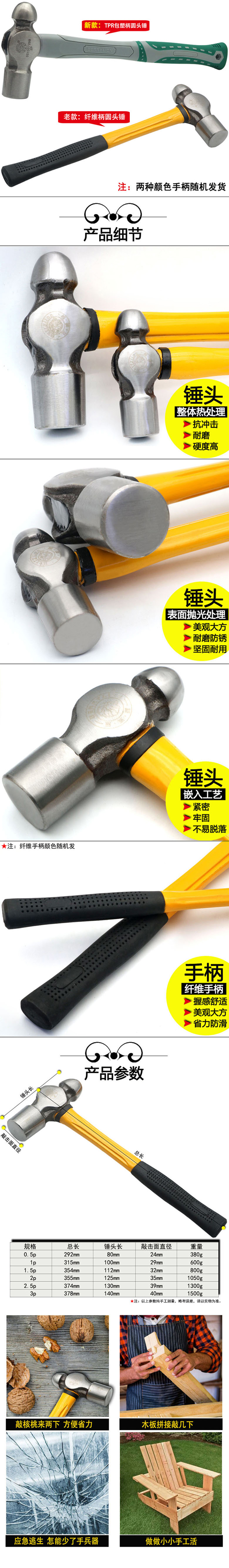 Budweiser Lion round-head hammer wooden handle fiber handle hammer nipple hammer multi-functional home repair woodworking small hammer hammer hammer wooden handle round-head hammer 0.5P/hand