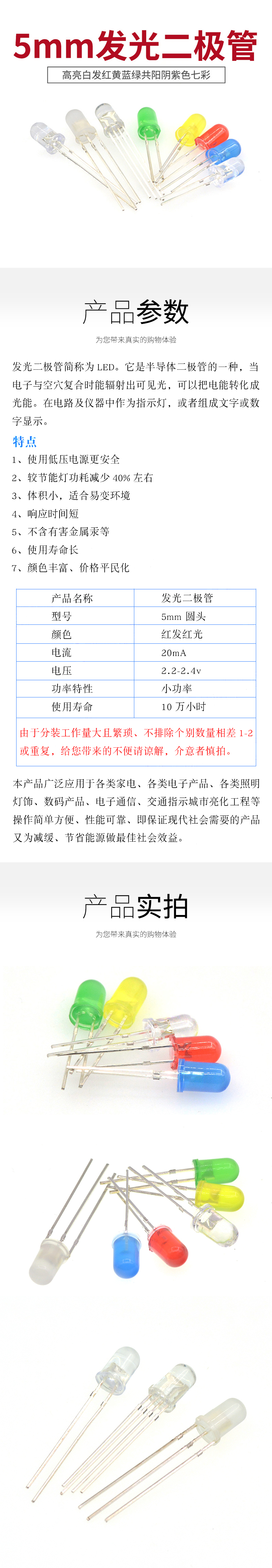 TaoTimeClub 5mm light-emitting diode LED lamp beads, high-brightness white hair, red, yellow, blue and green, total yin and yin, purple, colorful, full red and green hair, 5mm round head, white hair, white light, short feet (20 pieces)
