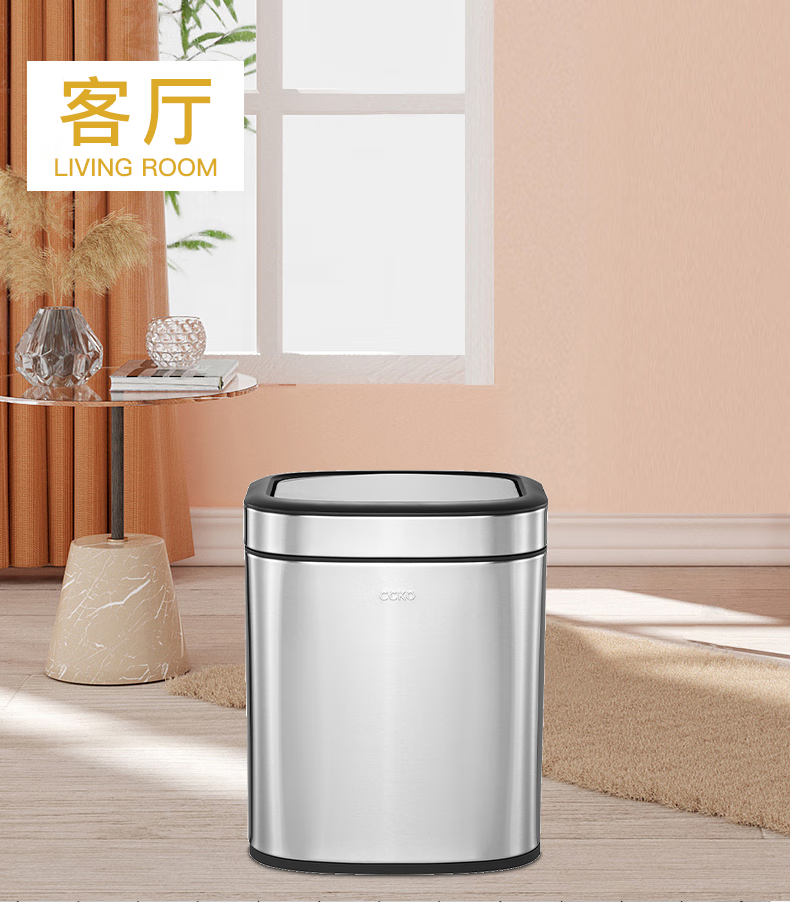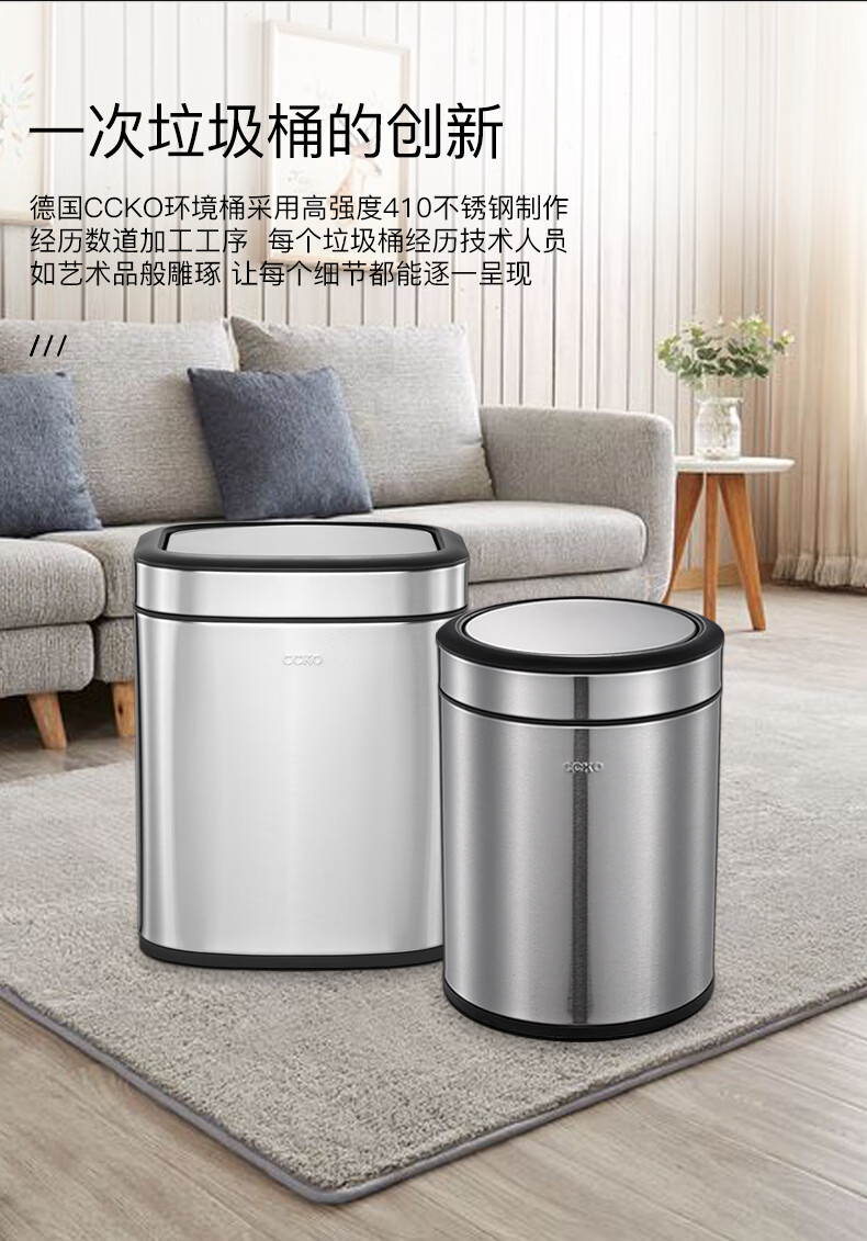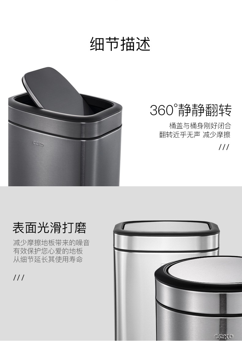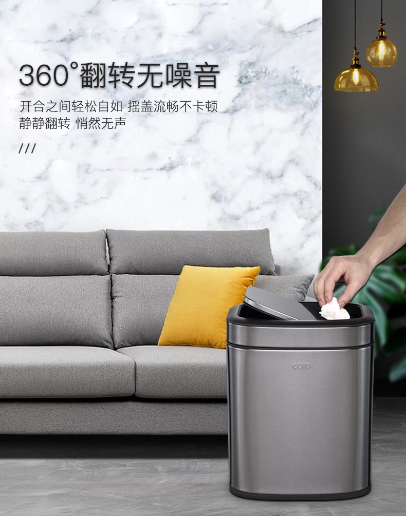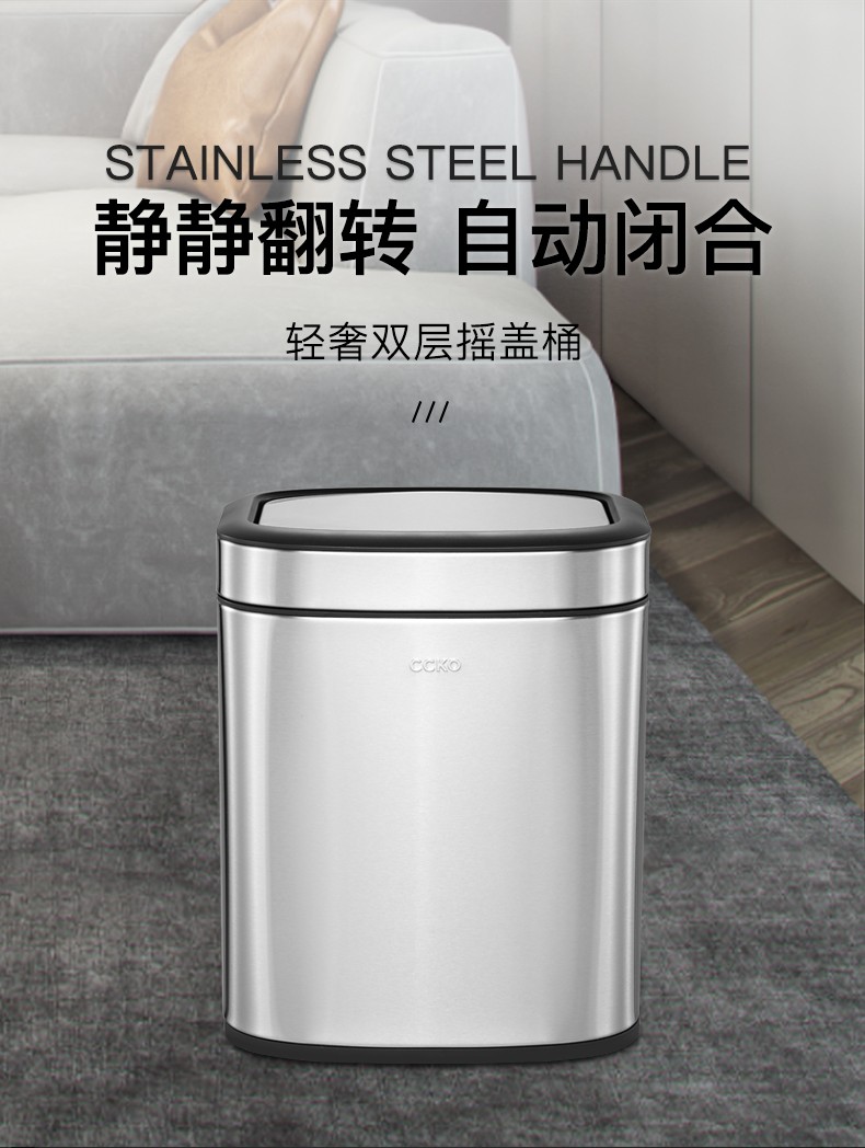 CCKO trash can household bathroom large living room bedroom commercial toilet simple flip-top kitchen trash can with lid square swing lid 6L sand steel (9908)