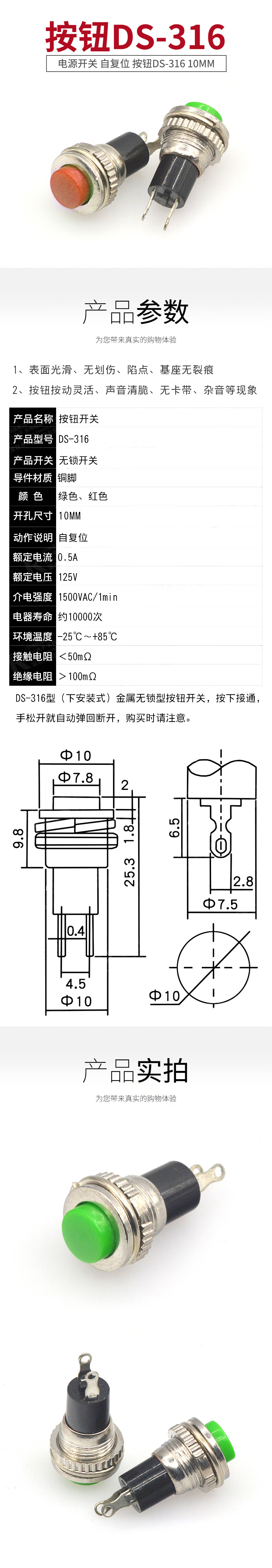 TaoTimeClub power switch self-reset button DS-316 10MM red and green upper wire lock-free switch lock-free switch 10MM green (2 pieces)