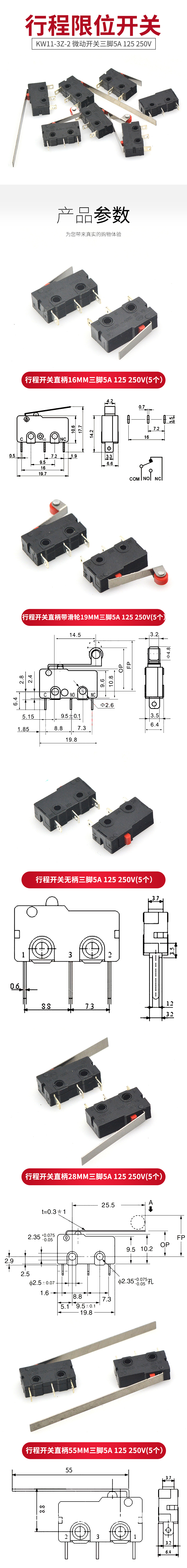 TaoTimeClub travel limit switch contact button KW11-3Z-2 micro switch straight handle three-legged straight handle with pulley 19MM three-legged 5A 125 250V