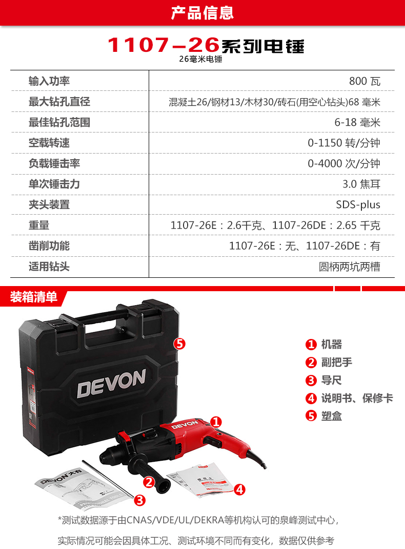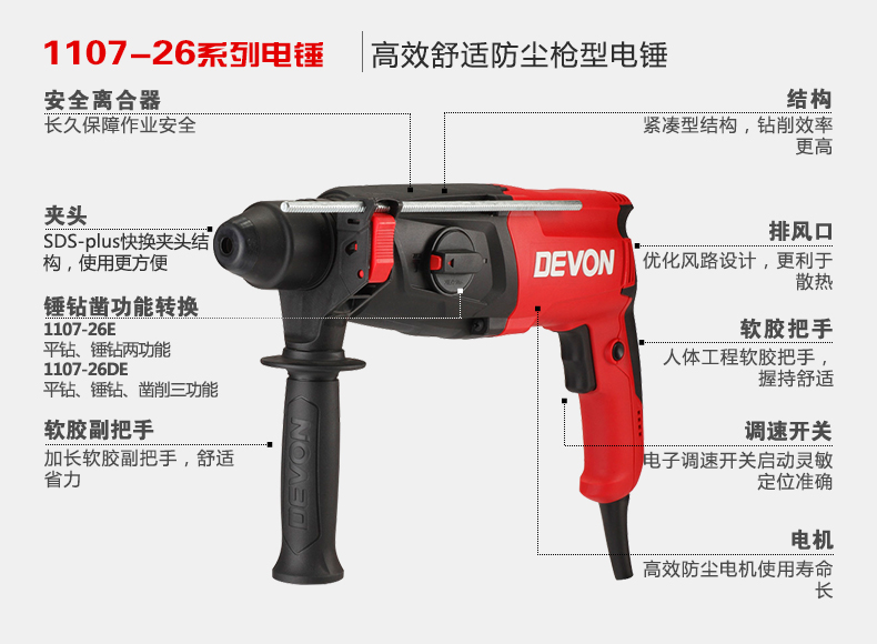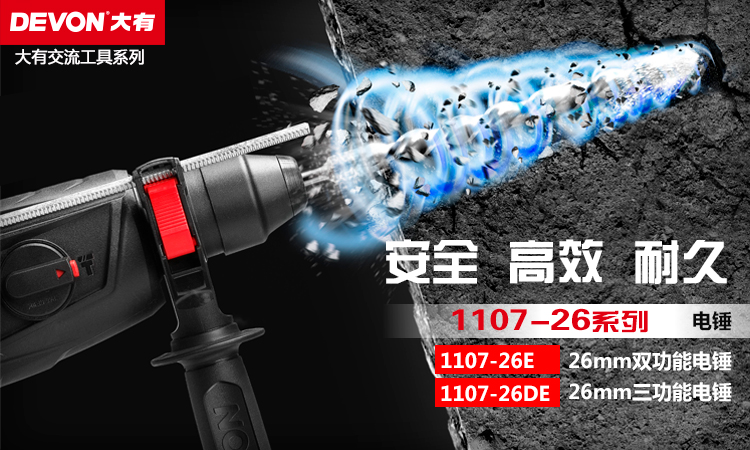 Devon three-function light electric hammer 1107-26DE drilling, hammering, adjustable speed, high-power tool box set