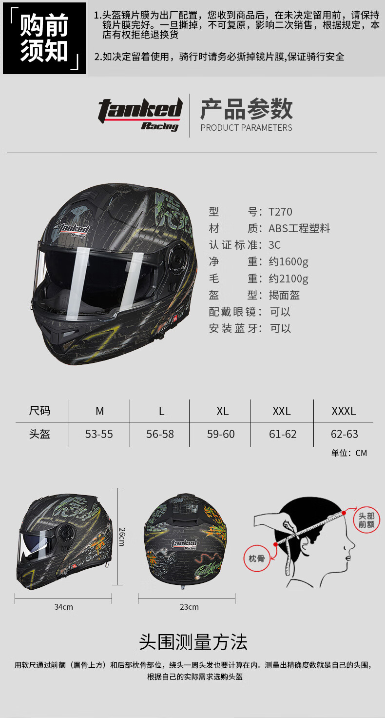 Tank motorcycle helmet T270 face-off helmet 3C certified dual-lens four-season helmet sub-black ghost night XL
