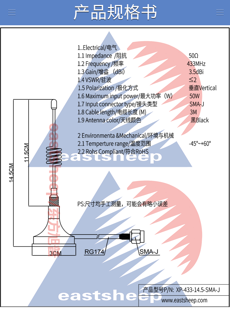 Dongfang Xupu 433MHz small suction cup antenna 3.5DB 14.5cm cable length 3 meters interface SMA male