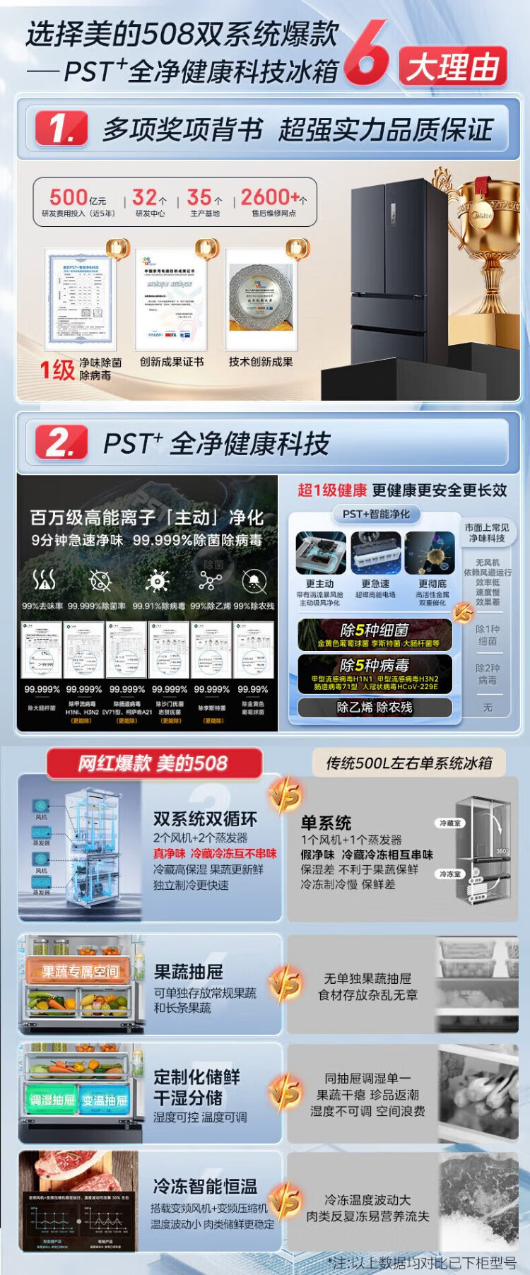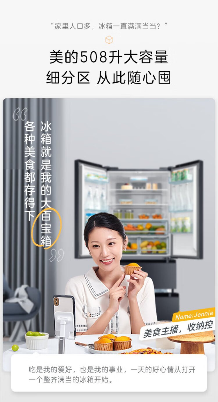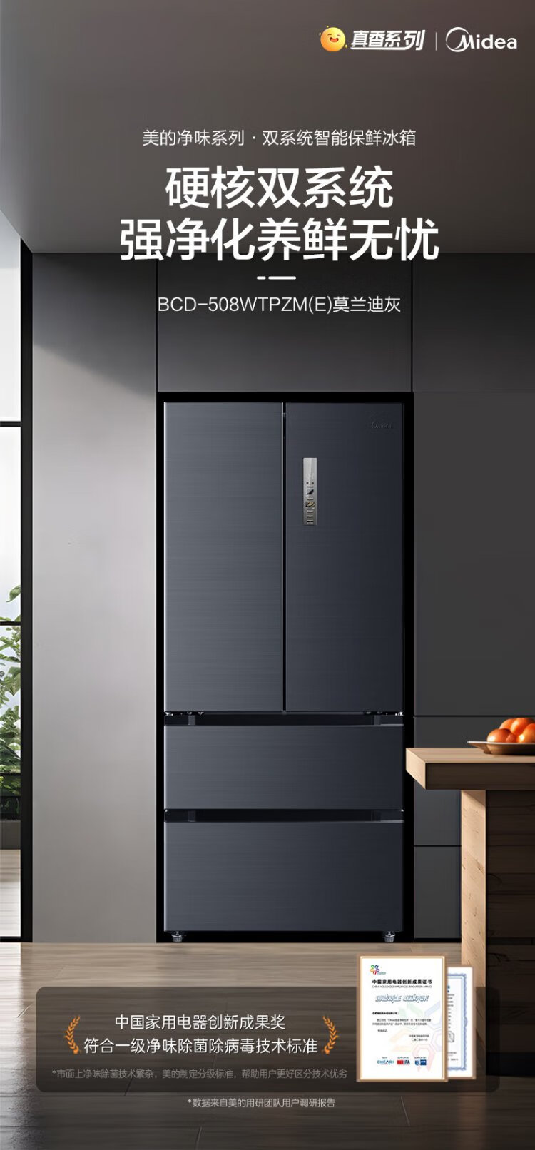 Midea 508-liter French-style multi-door household refrigerator with sterilization and odor-purifying dual systems large-capacity refrigerator household appliances true fragrance series BCD-508WTPZM(E) Subsidy Instant Discount 508-liter dual-system odor-purifying refrigerator
