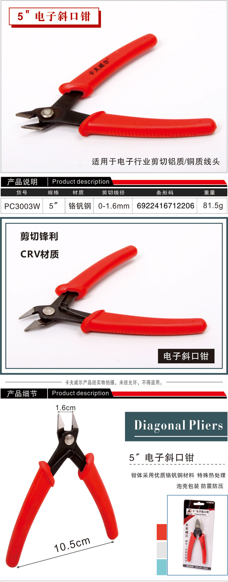 Kraftwell alloy steel diagonal pliers, water-mouthed pliers, offset pliers, 5-inch electronic wire cutter, cable tie cutter, PC3003W
