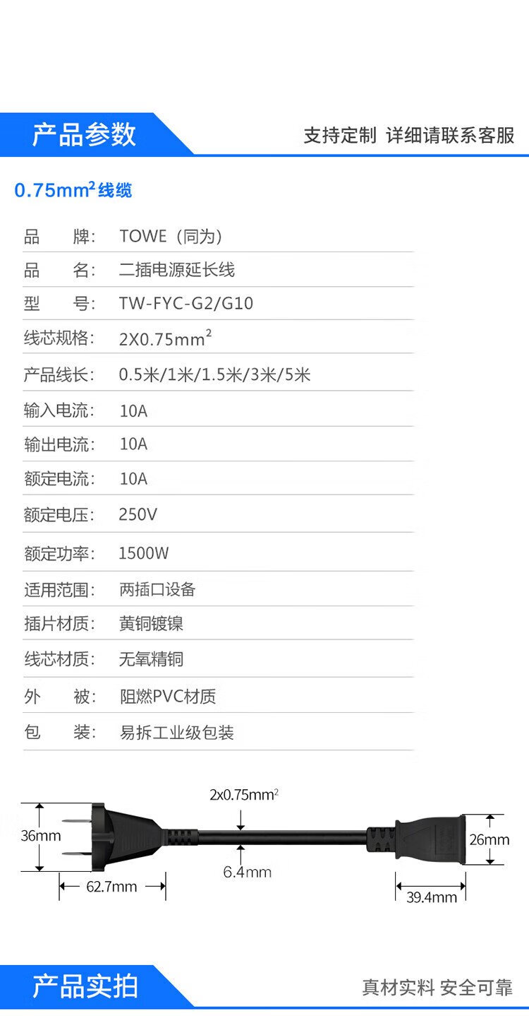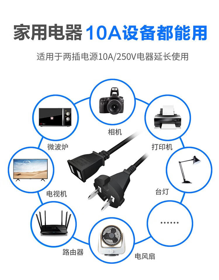 TOWE is also a 10A2 plug-in power extension cord with two plugs, electric vehicle charging extension cord, air conditioner, computer monitoring TV, extended plug socket 5 meters