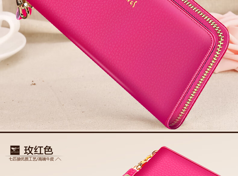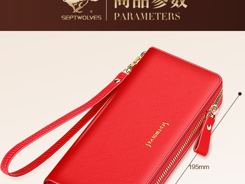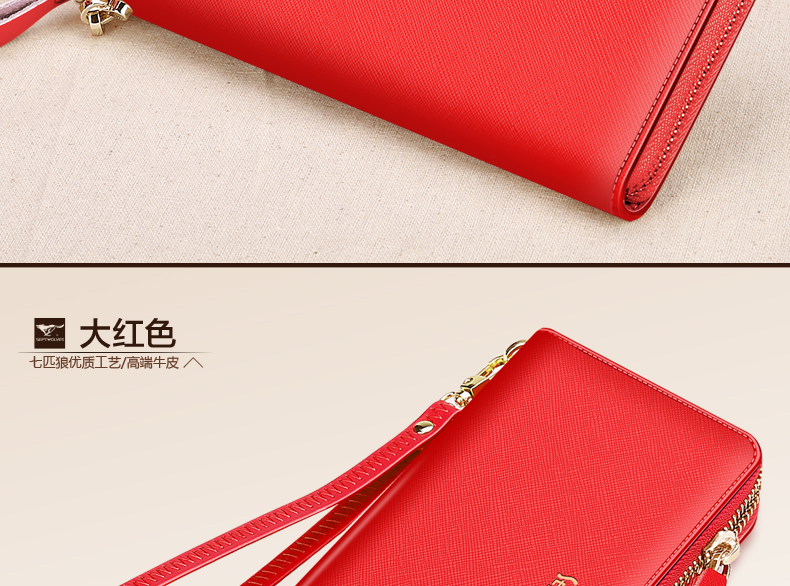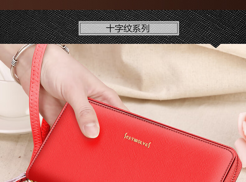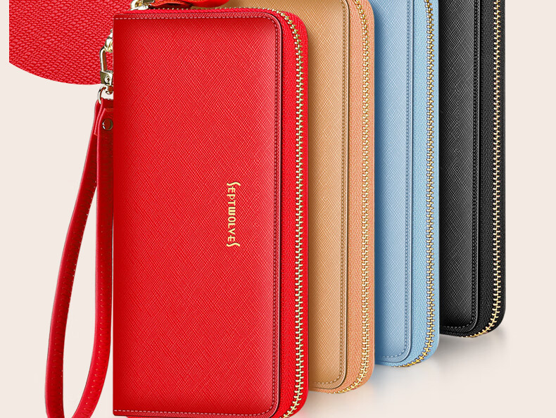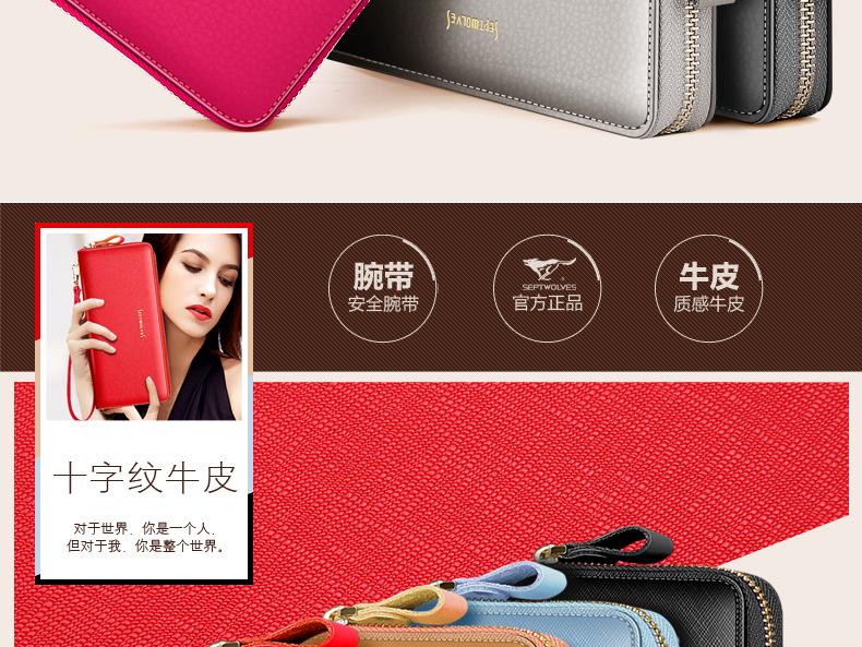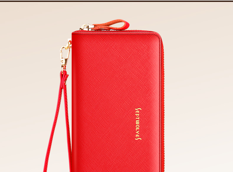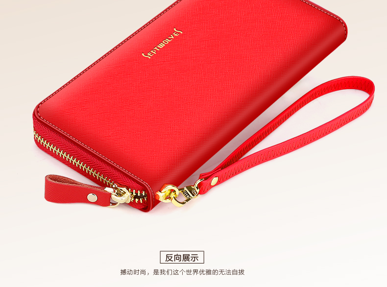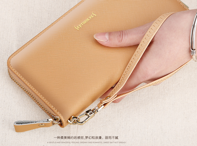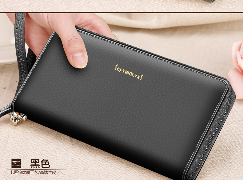 Septwolves wallet women's long zippered cowhide handbag large banknote holder large capacity Korean style women's bag 1 black (lychee pattern)