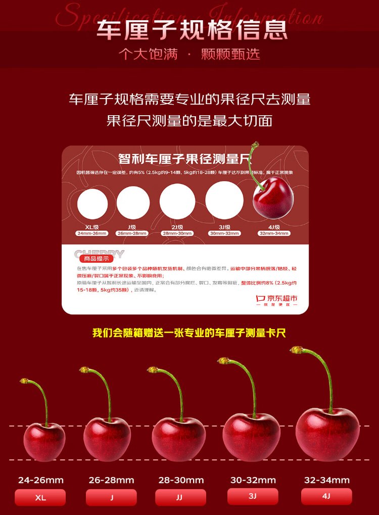 Jingxiansheng imported Chilean cherry Big Mac 3J grade 450g, fruit diameter about 30-32mm, fresh fruit