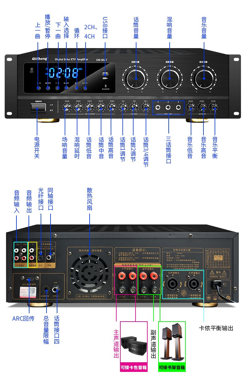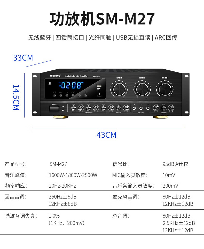 QISHENG SM-M27 fixed-resistance Bluetooth high-power amplifier home KTV audio set home amplifier karaoke professional conference room card package speaker heavy bass HIFI air amplifier M27 upgraded lossless version