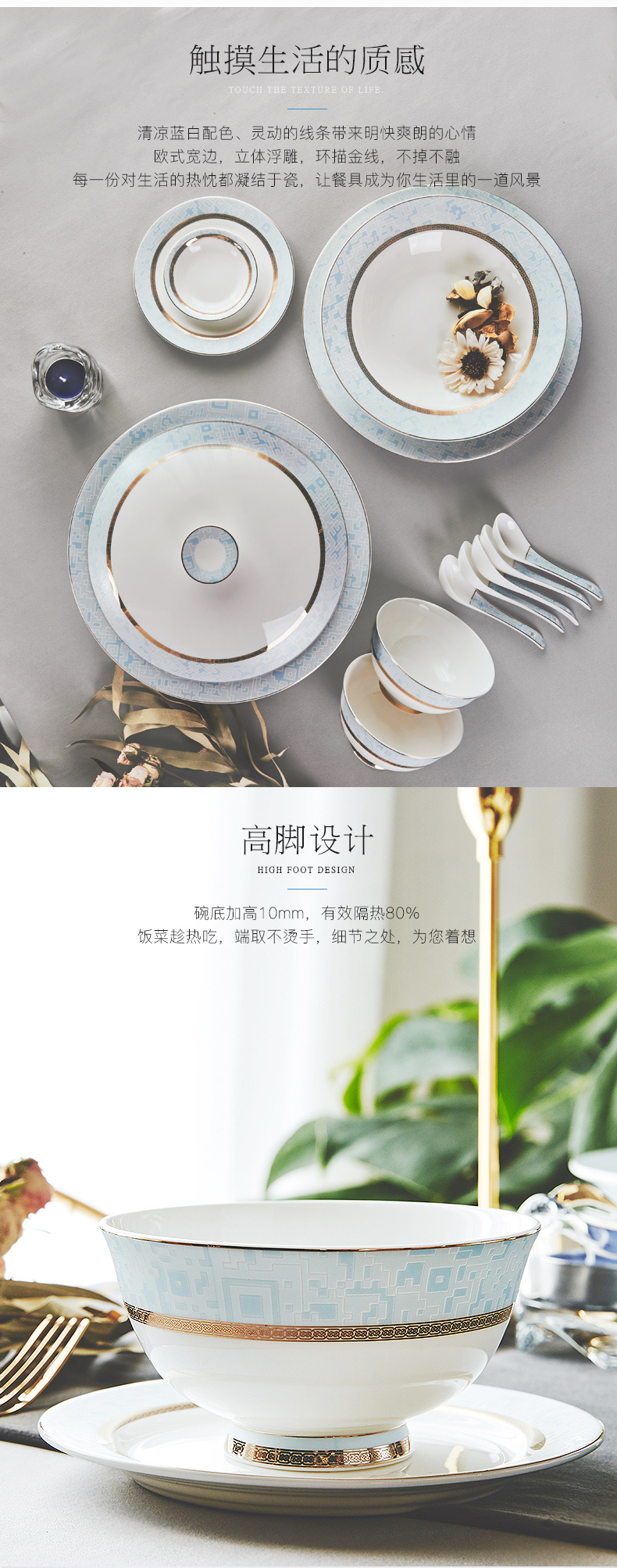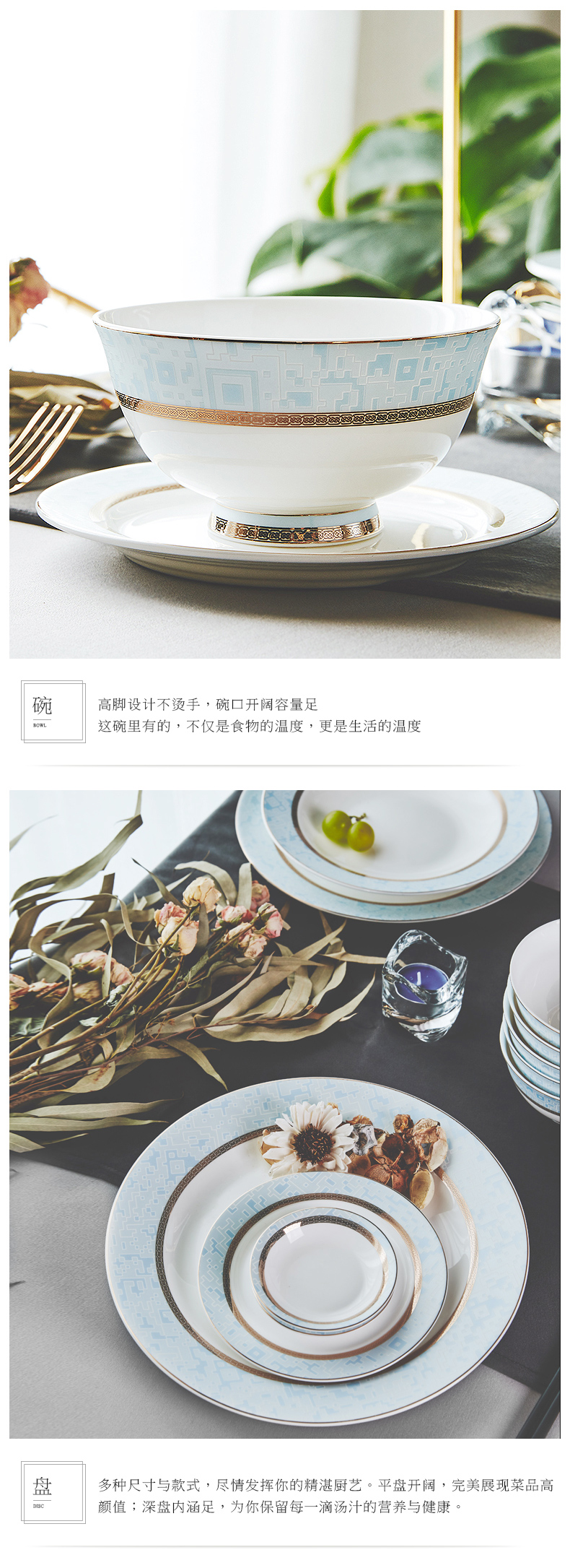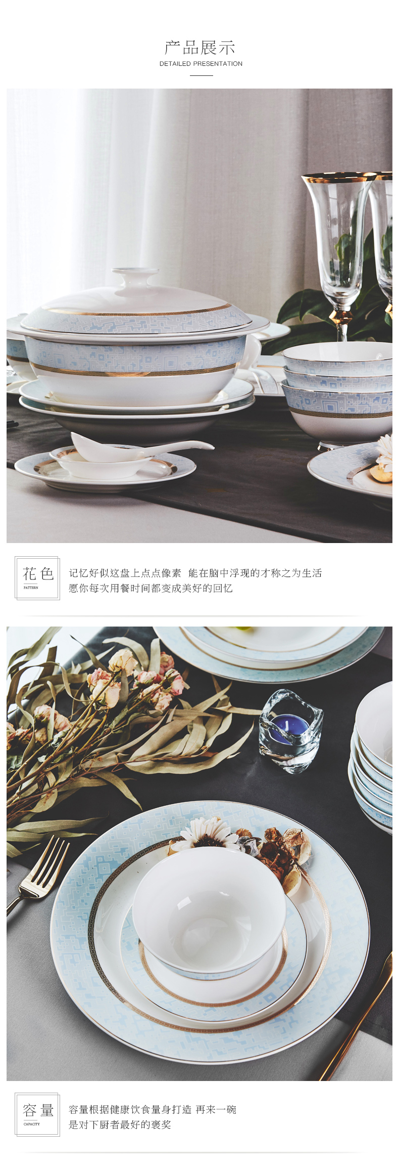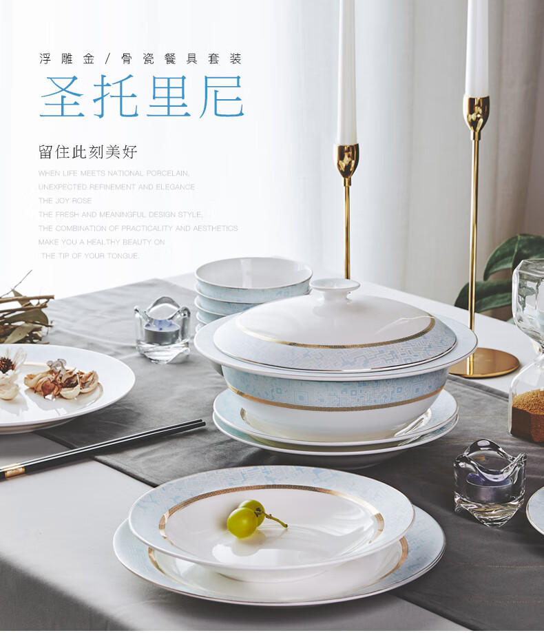 Huaguang National Porcelain Bone China Bowl Set Tableware Bowl Set Light Luxury Wedding Housewarming Gift Santorini 48-head Gift Box