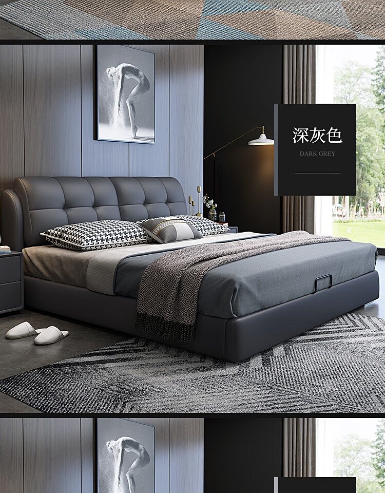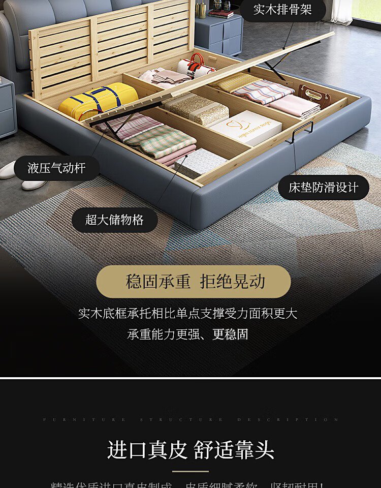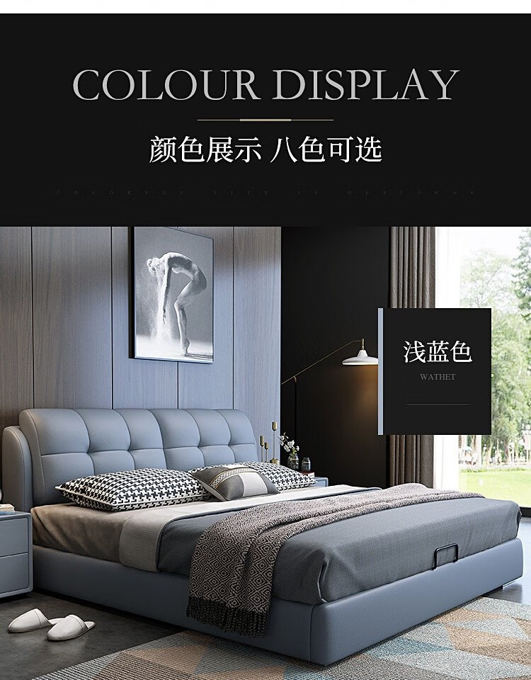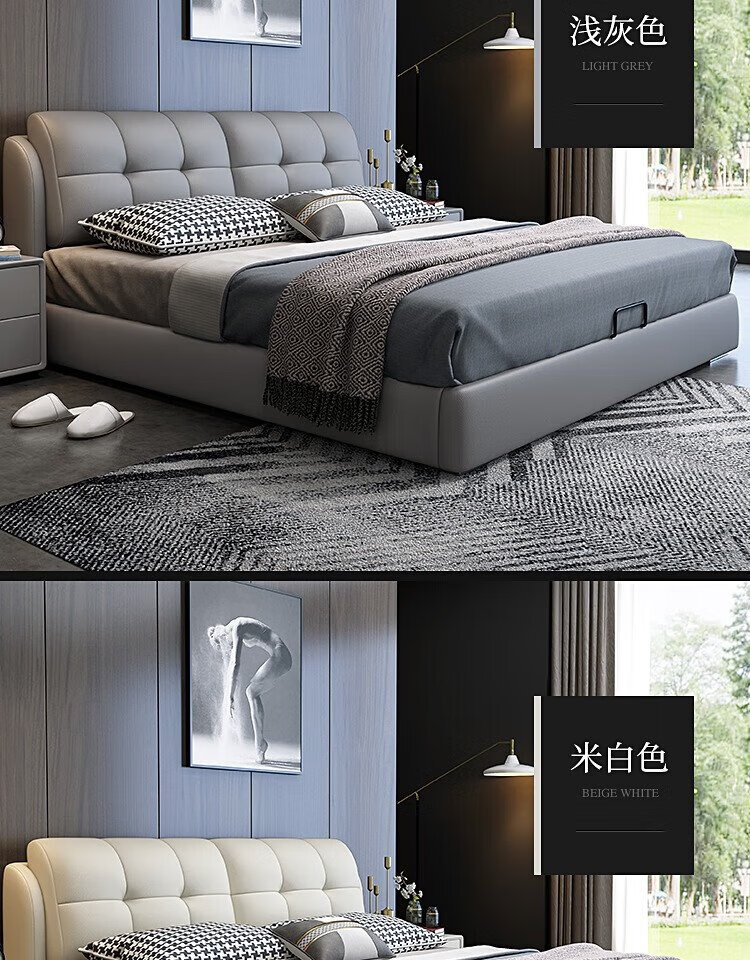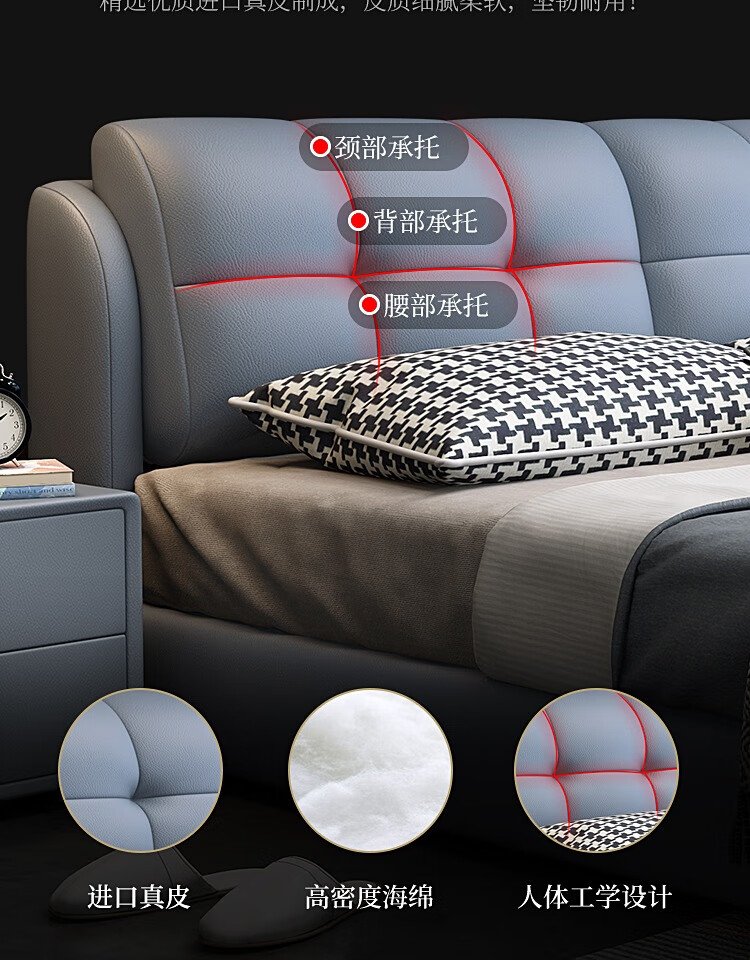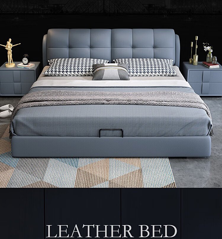 Baiguan Global Bed Leather Bed Bedroom Double Bed Modern Simple Master Bedroom Marriage Bed Solid Wood Soft Back High Box Leather Bed Furniture Bed+Bedside Table*2+Latex Mattress Frame Structure 1800mm*2000mm